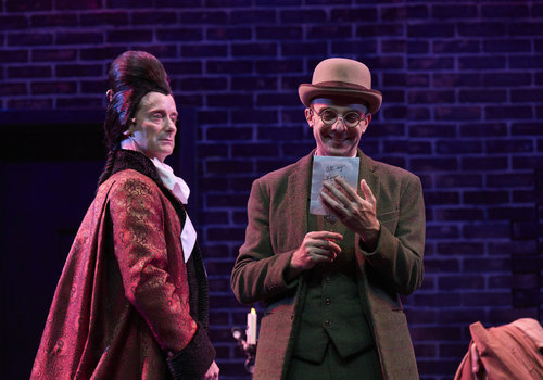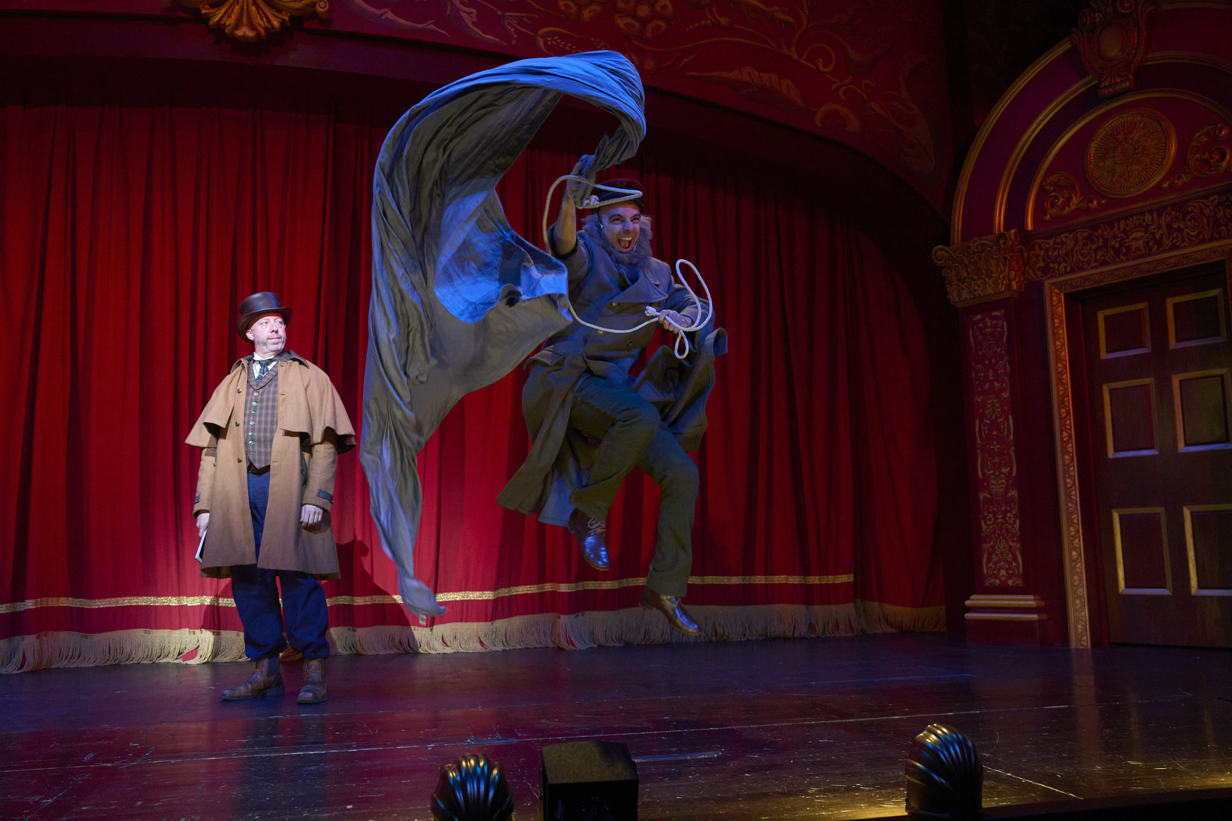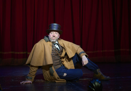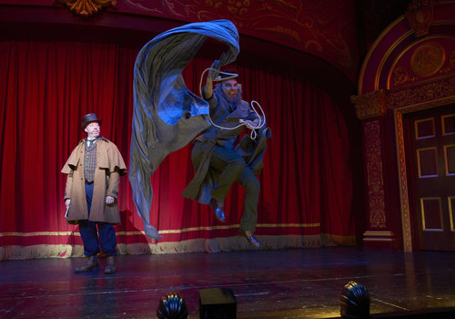 Professor Van Helsing (actor, Lynn Robert Berg*) looks on in disdain as one of his actors (actor, Joe Wegner*) gives an enthusiastic reenactment of a ship's voyage in the Great Lakes Theater production of Dracula: The Bloody Truth at the Hanna Theatre, Playhouse Square running through November 5. (Photo by Roger Mastroianni)