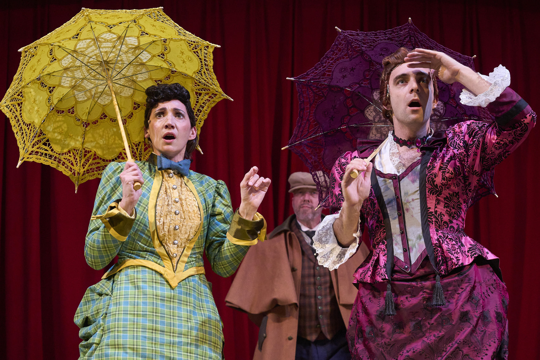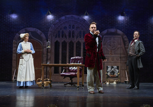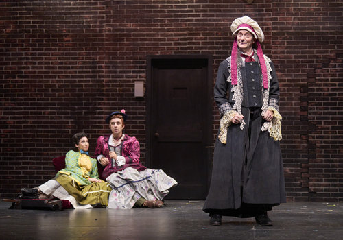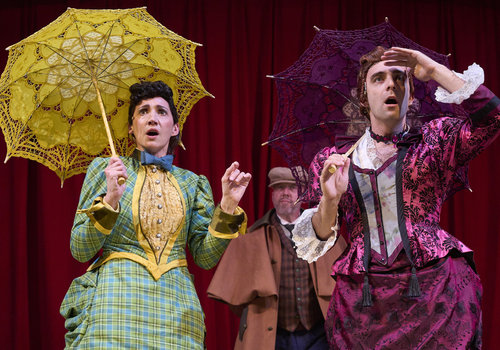 Mrs. Westerna (actor, Jeffrey C. Hawkins*) shares news with Mina (actor, Jodi Dominick*) and Lucy (actor, Joe Wegner*) in the Great Lakes Theater production of Dracula: The Bloody Truth at the Hanna Theatre, Playhouse Square, running through November 5. (Photo by Roger Mastroianni)