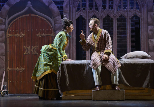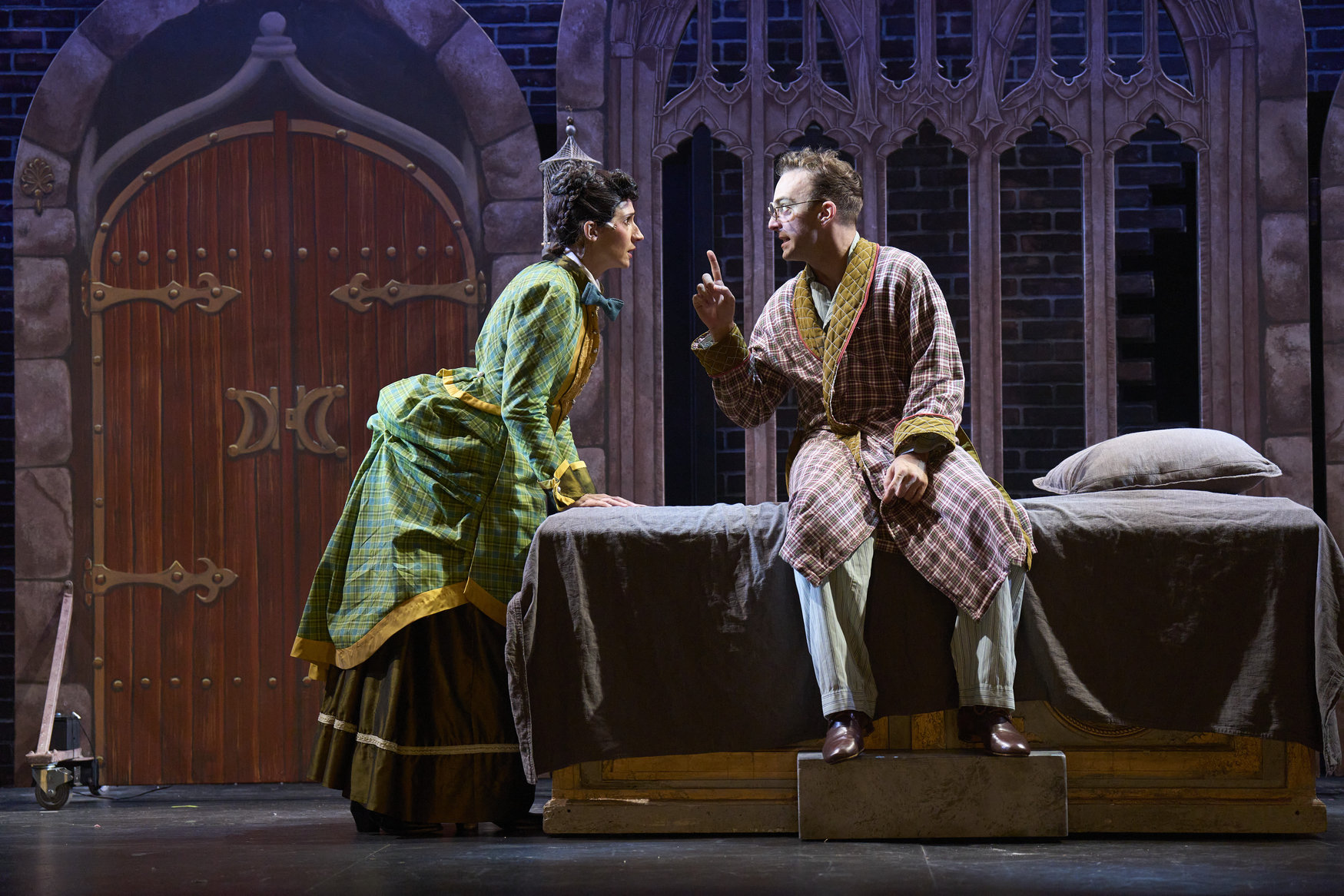 Jonathan Harker (actor, Joe Wegner*) adamantly argues to his now wife, Mina (actor, Jodi Dominick*), that he'll never tell what occurred at Dracula's castle in the Great Lakes Theater production Dracula: The Bloody Truth at the Hanna Theatre, Playhouse Square running through November 5. (Photo by Roger Mastroianni)
