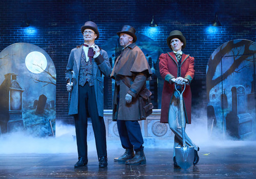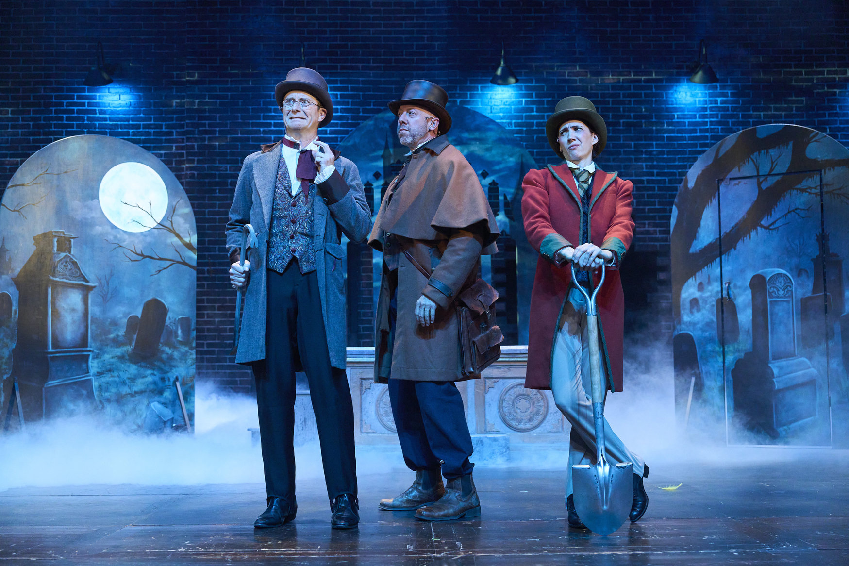 Dr. Seward (actor, Jeffrey C. Hawkins*), Professor Van Helsing (actor, Lynn Robert Berg*) and Arthur Holmwood (actor, Jodi Dominick*) meet in the cemetery at the behest of Van Helsing in the Great Lakes Theater production of Dracula: The Bloody Truth at the Hanna Theatre, Playhouse Square running through November 5. (Photo by Roger Mastroianni)