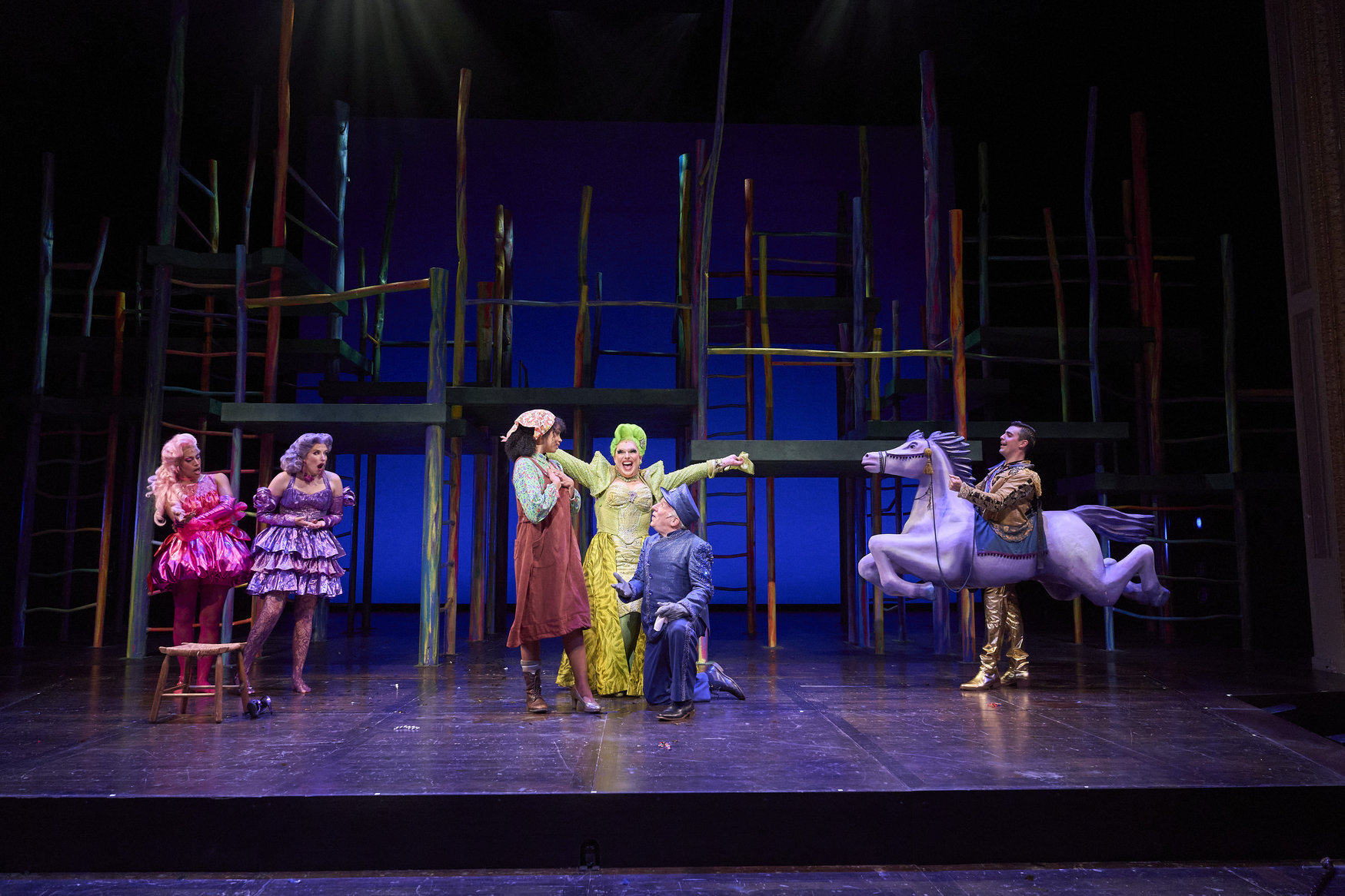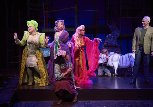 Lucinda (actor, Royer Bockus*), Florinda (actor, Zoë Lewis-McLean) and Cinderella's Stepmother (actor, Boe Wank*) rejoice that Cinderella (actor, RhonniRose Mantilla*) has married her Prince (actor, Dan Hoy*) in the Great Lakes Theater production of Into the Woods at the Hanna Theatre, Playhouse Square, running through November 10. (Photo by Roger Mastroianni)