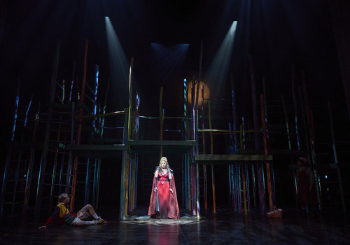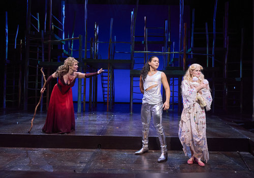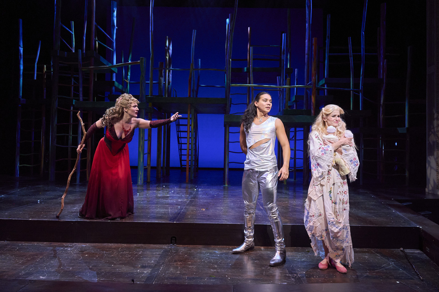 The Witch (actor Jillian Kates*) implores Rapunzel (actor Ángela Utrera*) to come with her as her Prince (actor Benjamin Michael Hall*) looks on in the Great Lakes Theater production of Into the Woods at the Hanna Theatre, Playhouse Square, running through November 10. (Photo by Roger Mastroianni)