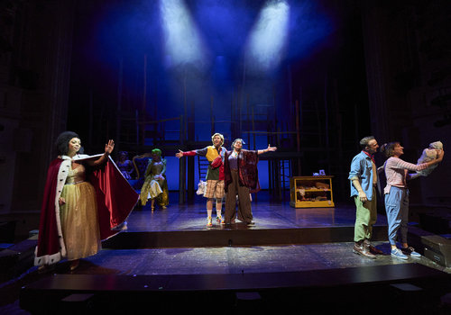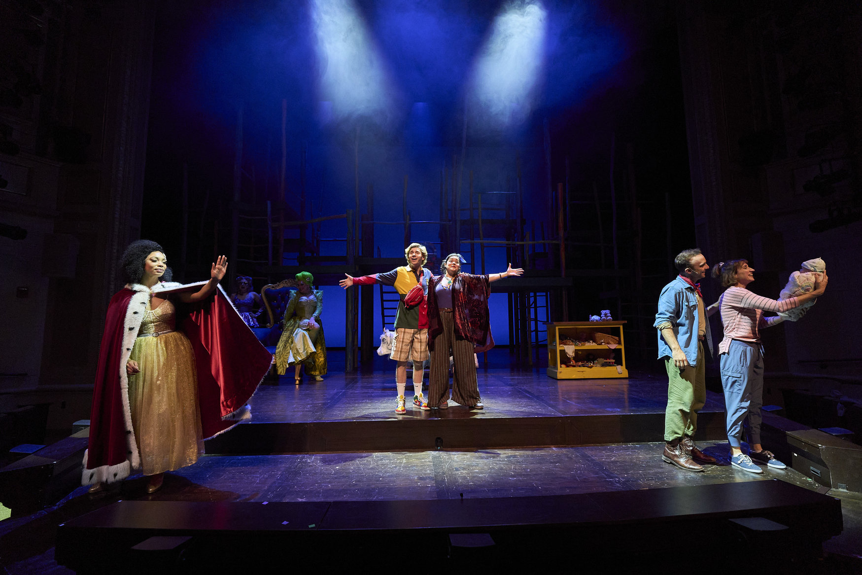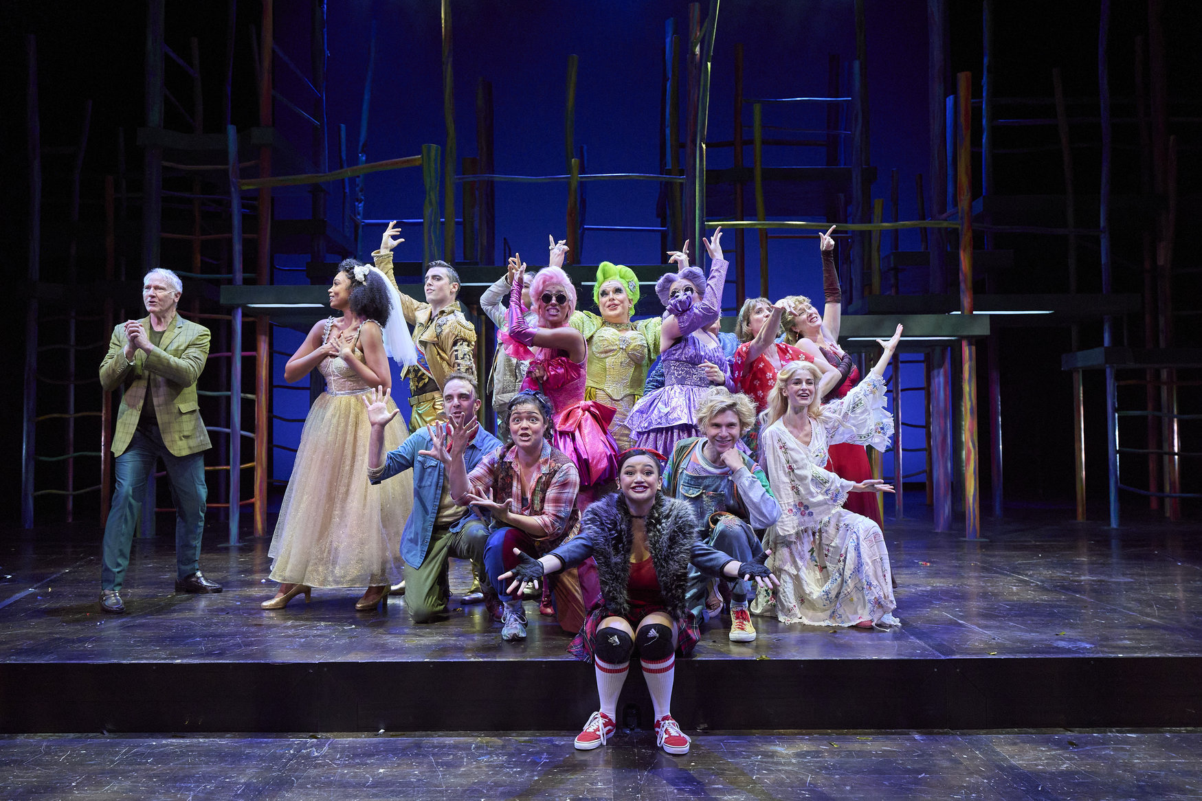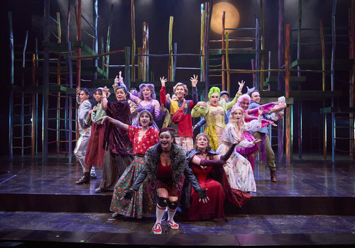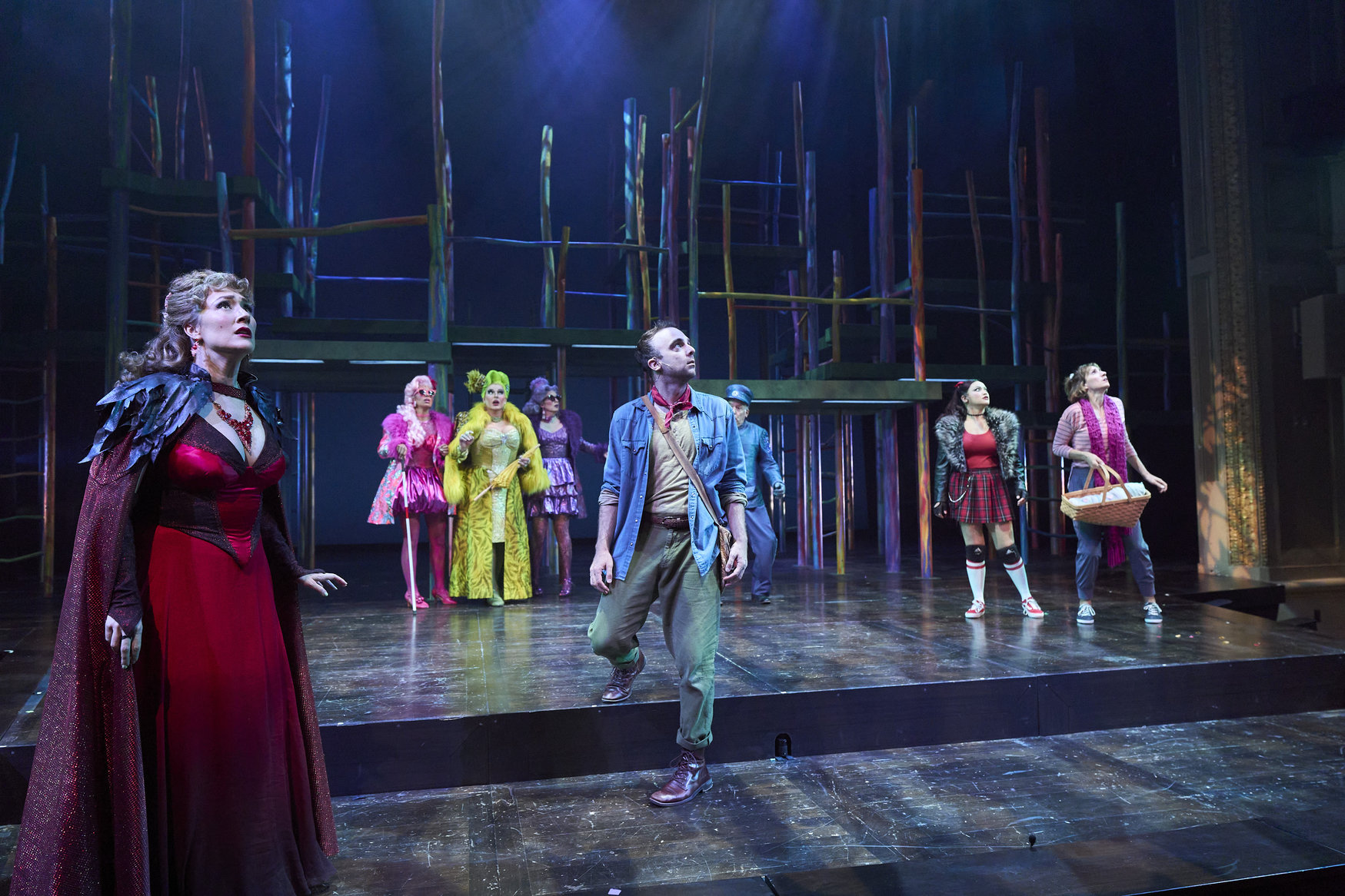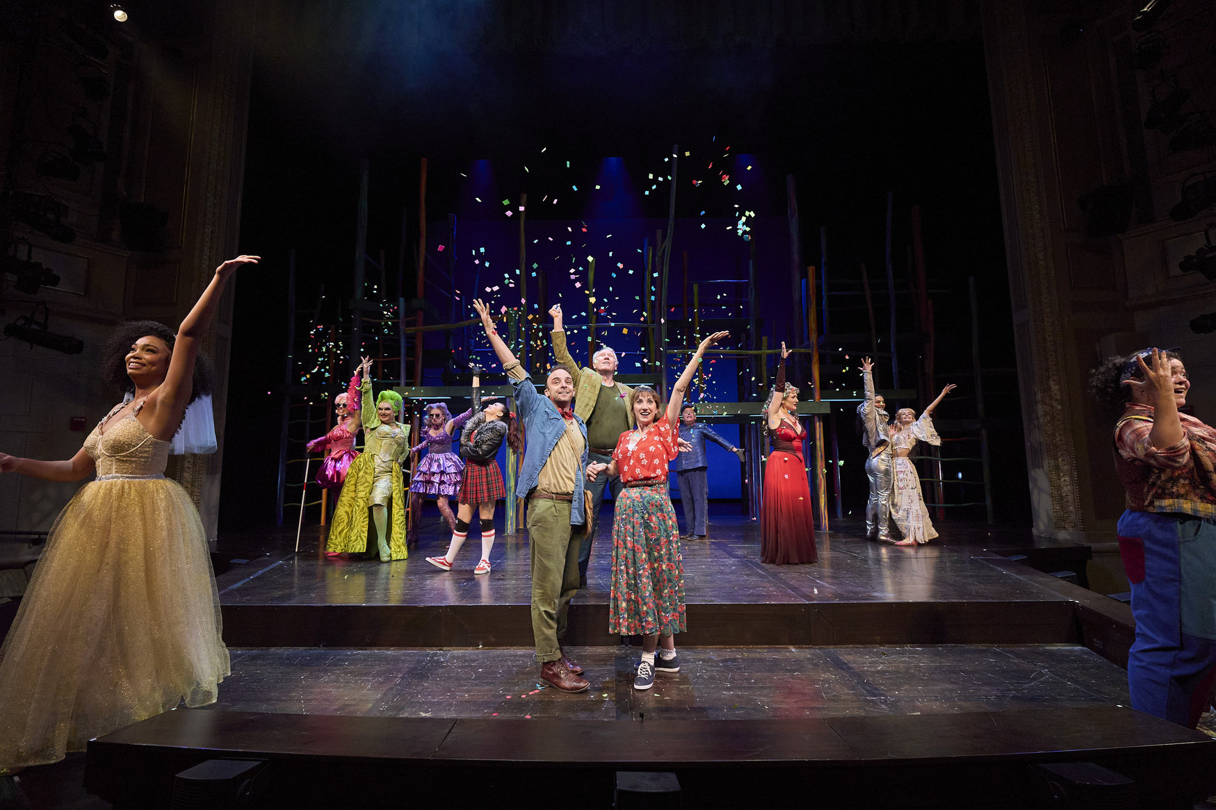 Everyone (actors from left to right, Brian Sutherland*, RhonniRose Mantilla*, Dan Hoy*, Joe Wegner*, Benjamin Michael Hall*, Jessie Cope Miller*, Zoë Lewis-McLean, Boe Wank*, Jaedynn Latter, Royer Bockus*, Nic Hermick*, Jodi Dominick*, Ángela Utrera* and Jillian Kates*) rejoice in the Great Lakes Theater production of Into the Woods at the Hanna Theatre, Playhouse Square, running through November 10. (Photo by Roger Mastroianni)