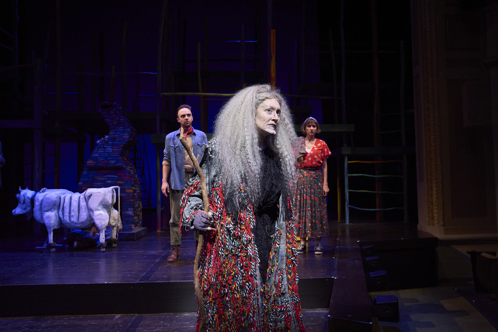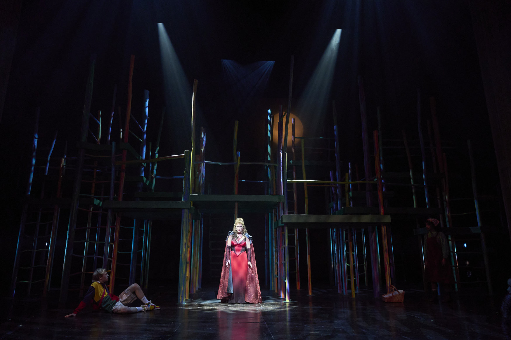 The Witch (actor Jillian Kates*) descends upon The Baker (actor Joe Wegner*) and his wife (actor Jodi Dominick*) in the Great Lakes Theater production of Into the Woods at the Hanna Theatre, Playhouse Square, running through November 10. (Photo by Roger Mastroianni)