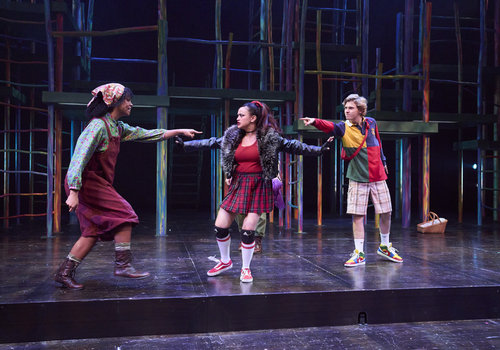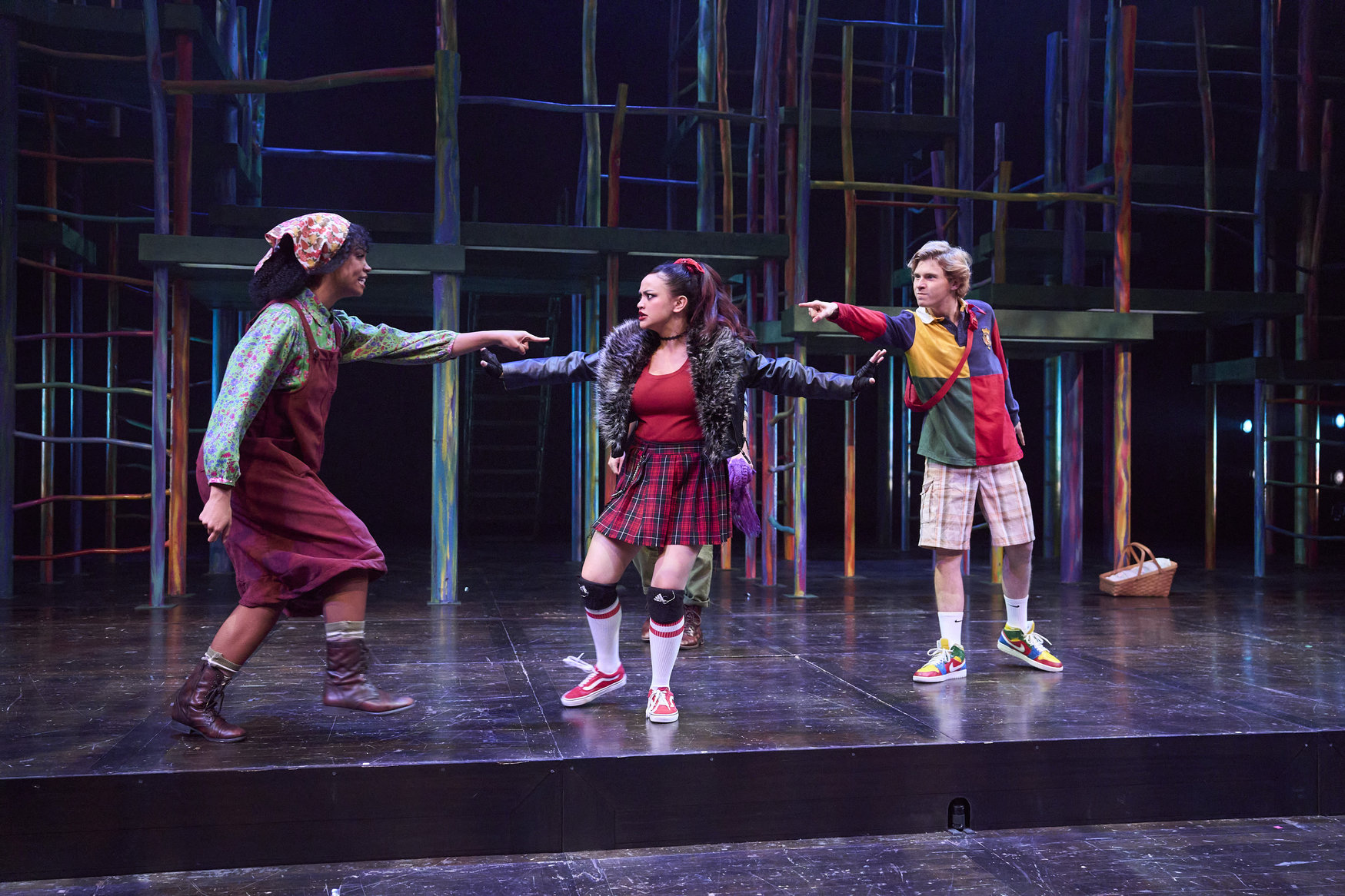 Cinderella (actor RhonniRose Mantilla*) and Jack (actor Nic Hermick*) place blame on Little Red (actor Jaedynn Latter) in the Great Lakes Theater production of Into the Woods at the Hanna Theatre, Playhouse Square, running through November 10. (Photo by Roger Mastroianni)