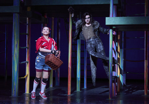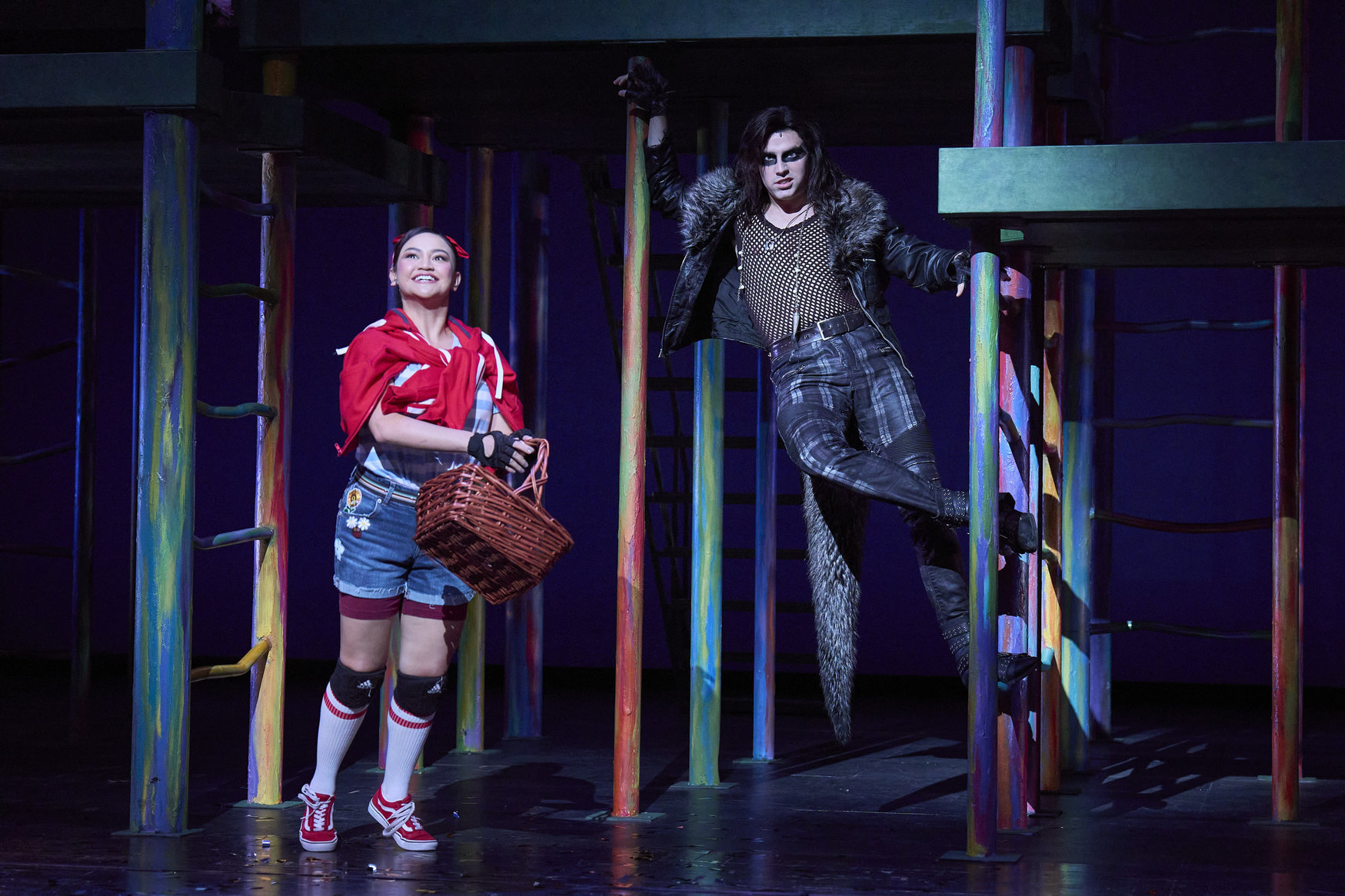 Little Red (actor Jaedynn Latter) and The Wolf (actor Dan Hoy*) meet in the Great Lakes Theater production of Into the Woods at the Hanna Theatre, Playhouse Square, running through November 10. (Photo by Roger Mastroianni)