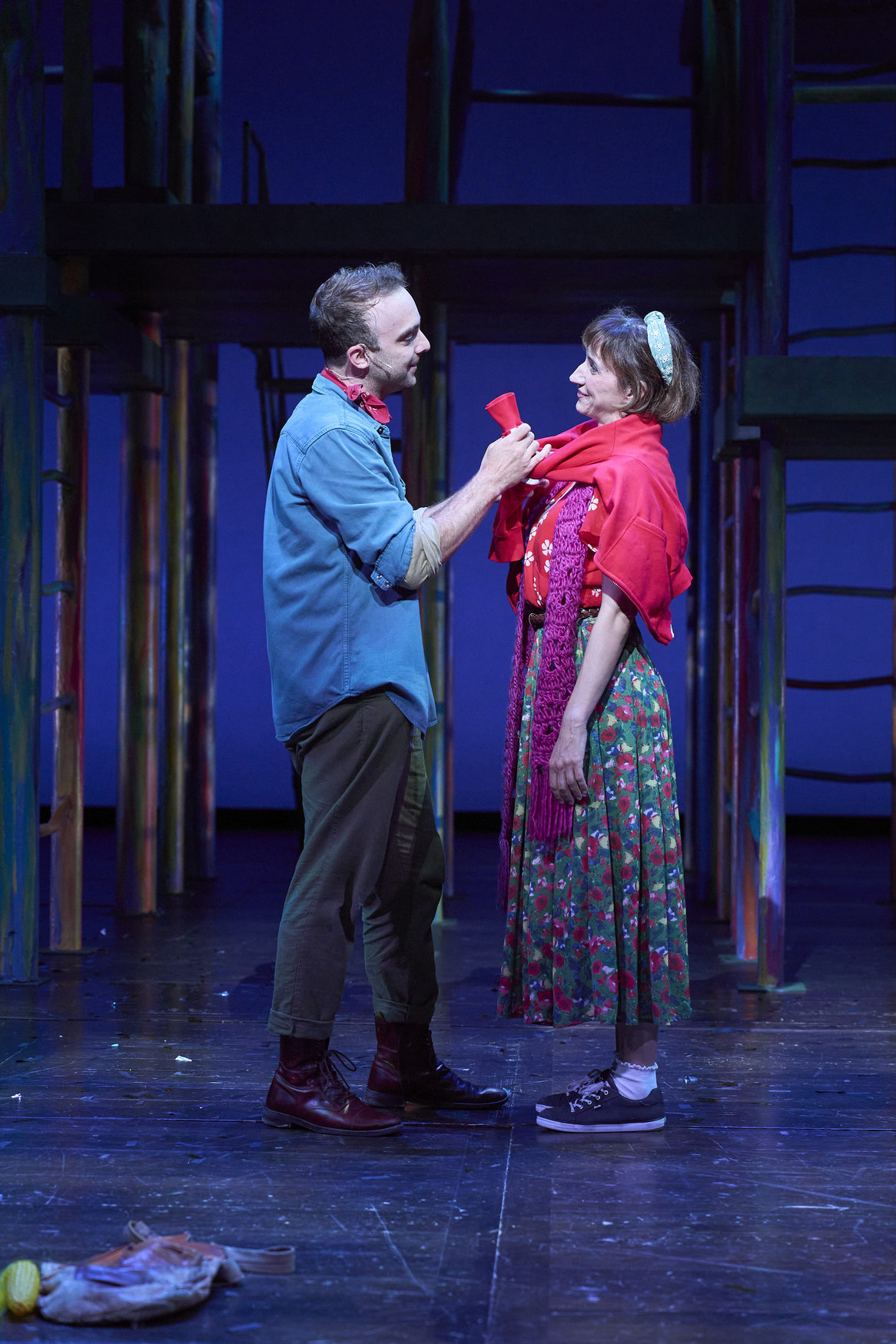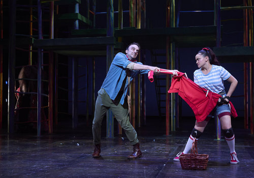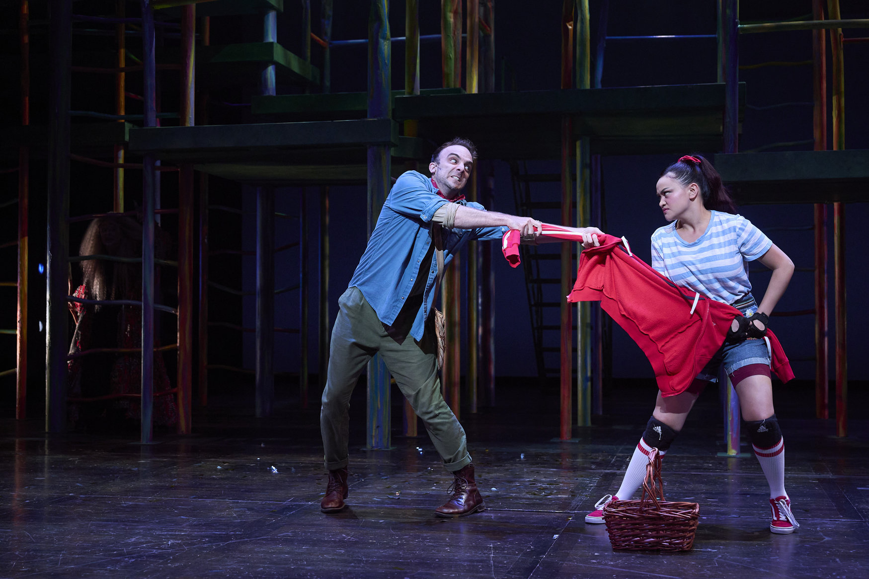 The Baker (actor Joe Wegner*) and Little Red (actor Jaedynn Latter) fight over her red cloak in the Great Lakes Theater production of Into the Woods at the Hanna Theatre, Playhouse Square, running through November 10. (Photo by Roger Mastroianni)