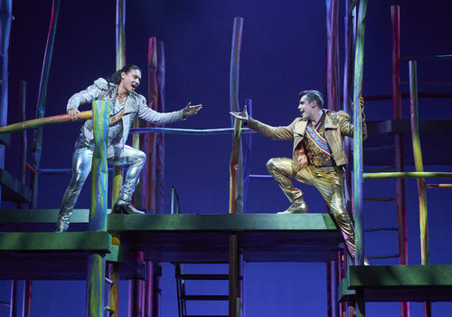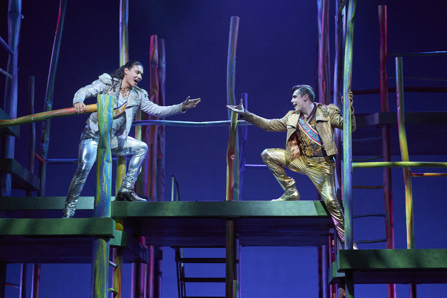 Rapunzel's Prince (actor, Benjamin Michael Hall*) and Cinderella's Prince (actor, Dan Hoy*) share in their collective "Agony" in the Great Lakes Theater production of Into the Woods at the Hanna Theatre, Playhouse Square, running through November 10. (Photo by Roger Mastroianni)