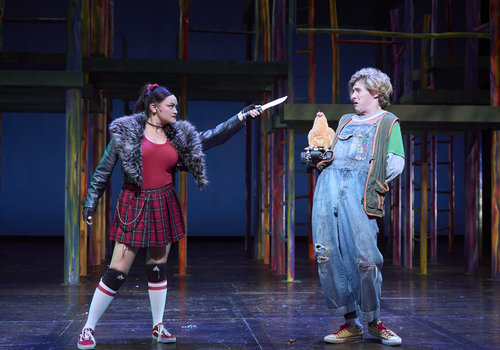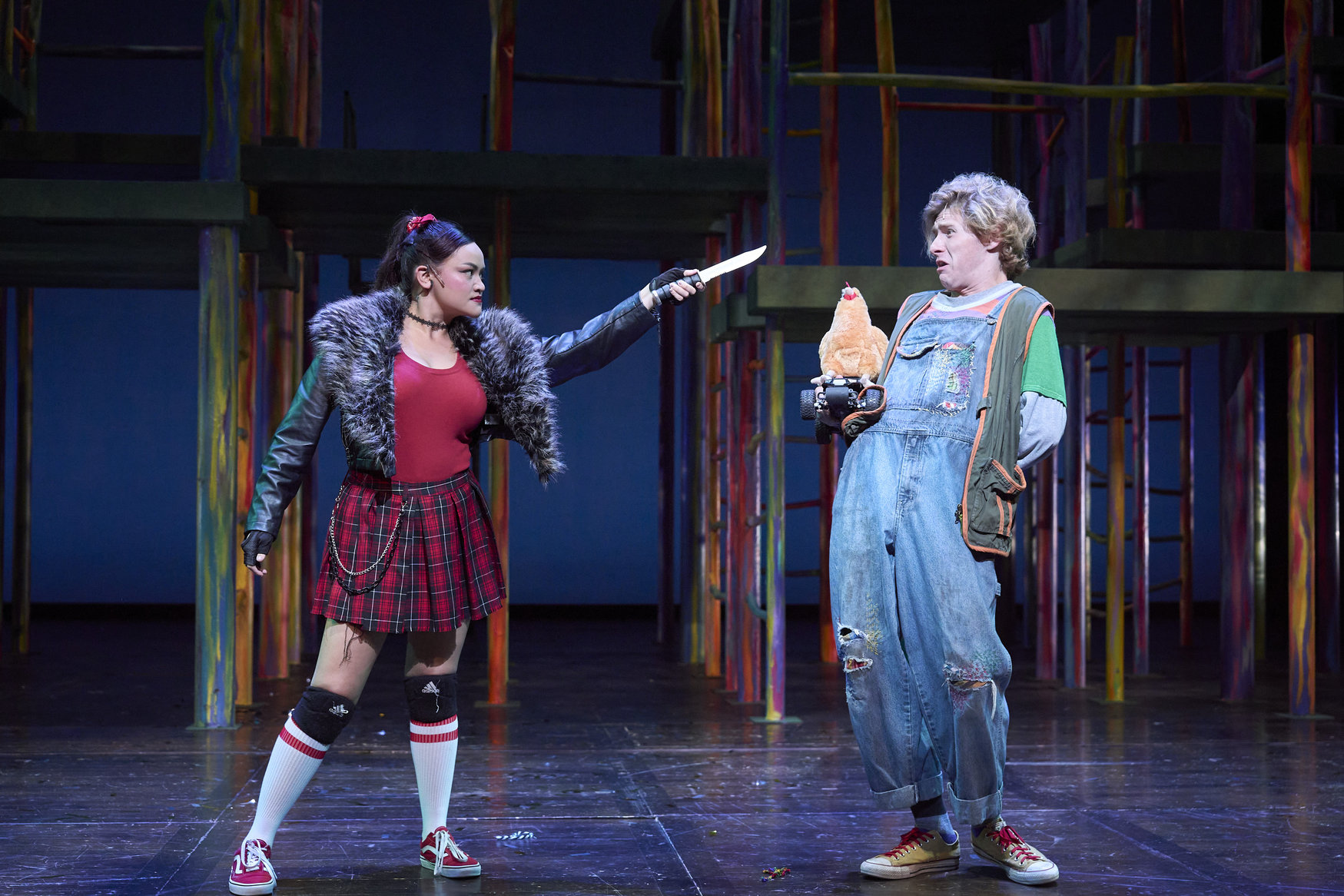 Little Red (actor Jaedynn Latter) confronts Jack (actor Nic Hermick*) in the Great Lakes Theater production of Into the Woods at the Hanna Theatre, Playhouse Square, running through November 10. (Photo by Roger Mastroianni)