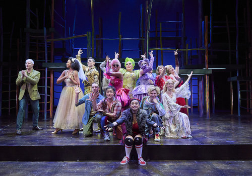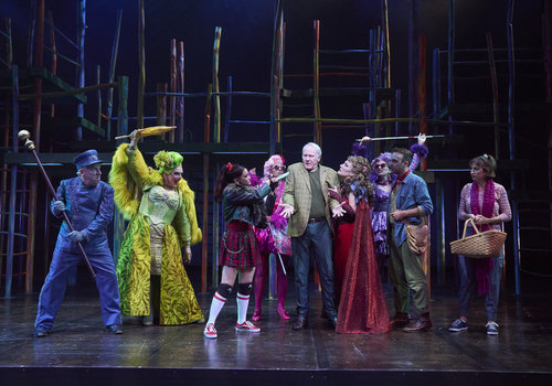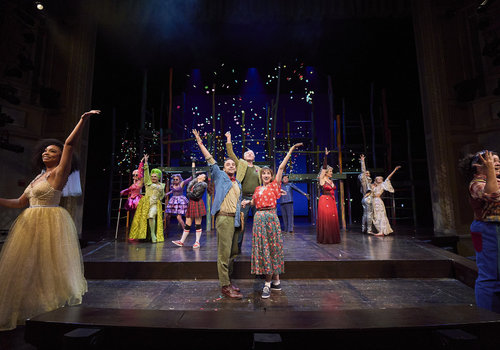 Everyone (actors from left to right, RhonniRose Mantilla*, Zoë Lewis-McLean, Boe Wank*, Royer Bockus* Jaedynn Latter, Joe Wegner*, Brian Sutherland*, Jodi Dominick*, M.A. Taylor*, Jillian Kates*, Benjamin Michael Hall*, Ángela Utrera* and Jessie Cope Miller*) enjoy their "happily ever after" in the Great Lakes Theater production of Into the Woods at the Hanna Theatre, Playhouse Square, running through November 10. (Photo by Roger Mastroianni)