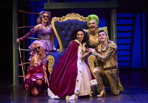 Everyone (actors from left to right, Zoë Lewis-McLean, Royer Bockus*, Boe Wank*, M.A. Taylor* and Dan Hoy*) react to the fact Cinderella (actor RhonniRose Mantilla*) is found to be the owner of the golden slipper in the Great Lakes Theater production of Into the Woods at the Hanna Theatre, Playhouse Square, running through November 10. (Photo by Roger Mastroianni)