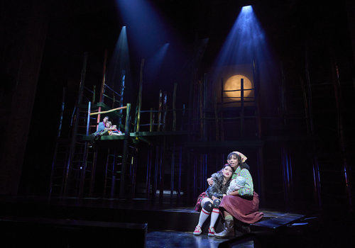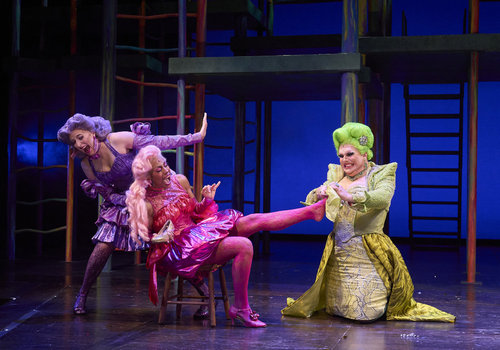Lucinda (actor, Royer Bockus*) and Florinda (actor, Zoë Lewis-McLean) are terrified to learn of the lengths their mother (actor, Boe Wank*) will go to secure marriage to the Prince in the Great Lakes Theater production of Into the Woods at the Hanna Theatre, Playhouse Square, running through November 10. (Photo by Roger Mastroianni)