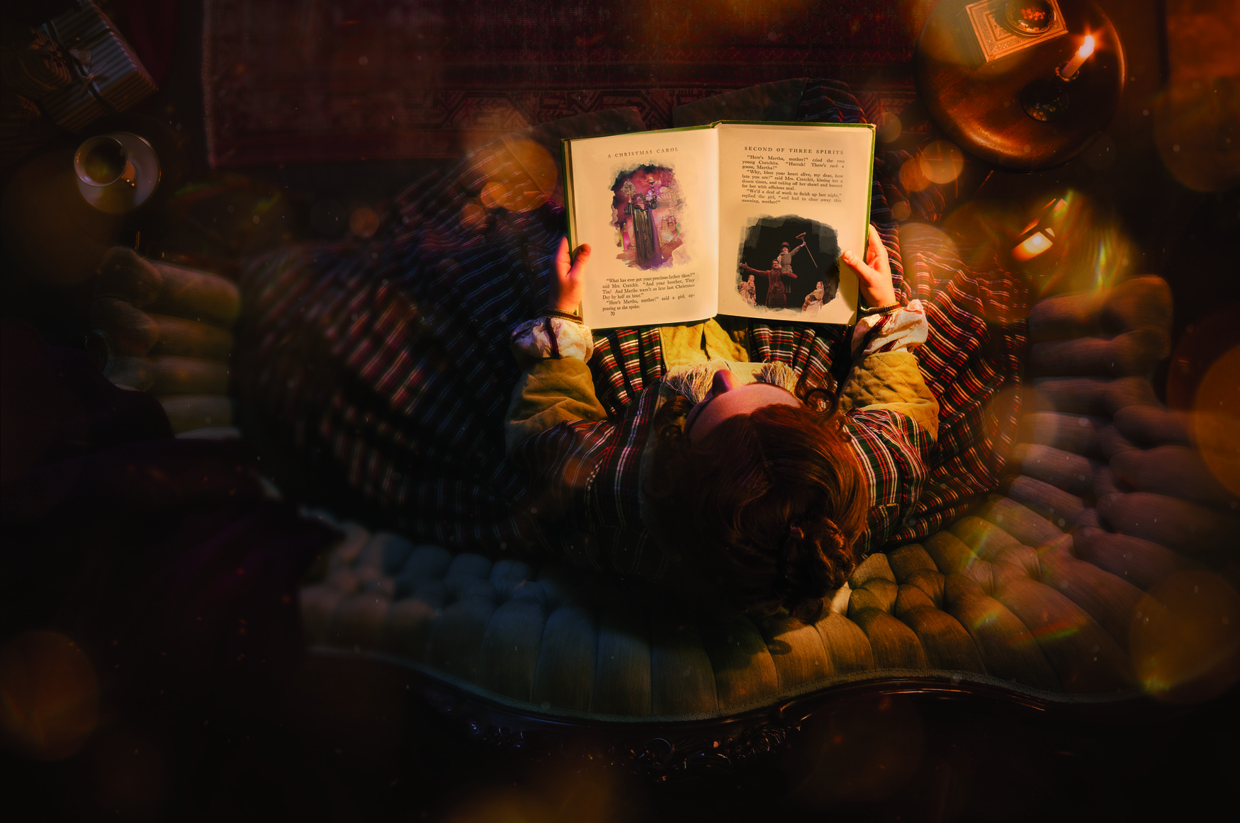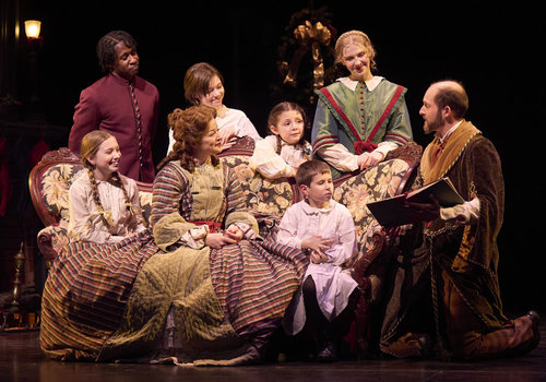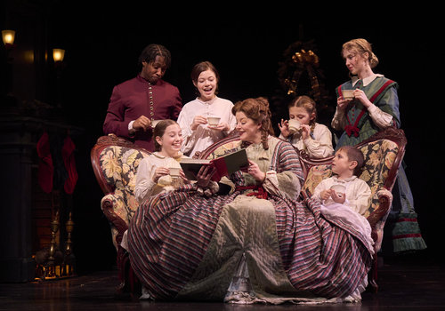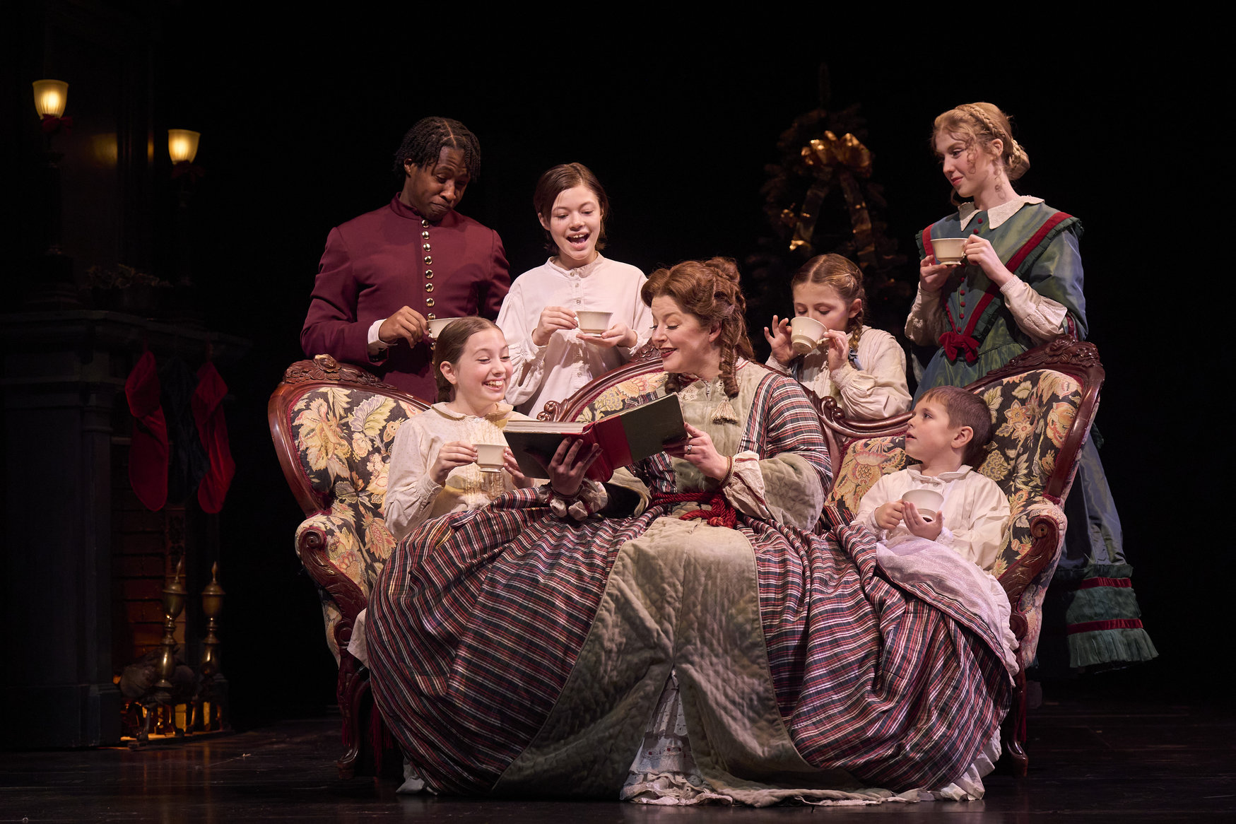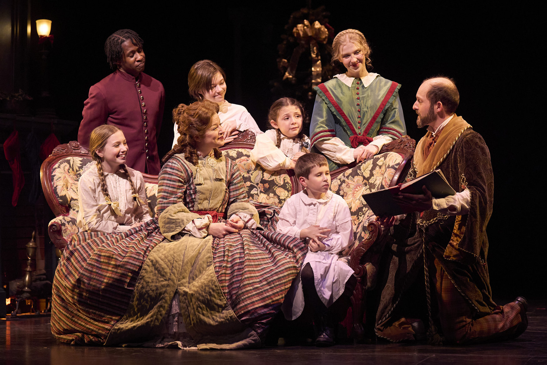 The Cleaveland family (actors from L to R: Aamar-Malik Culbreth, Morgan Lehman, Marlowe Miller, Paige Lewis, Alex Fynn Kenney and Eileen Brady) celebrate the holiday season with the Charles Dickens classic A CHRISTMAS CAROL, as read by Mother Cleaveland (actor, Laura Welsh*) in Great Lakes Theater’s production of Charles Dickens’ holiday classic A CHRISTMAS CAROL onstage at the Mimi Ohio Theatre, Playhouse Square through December 22. (Photography by Roger Mastroianni)