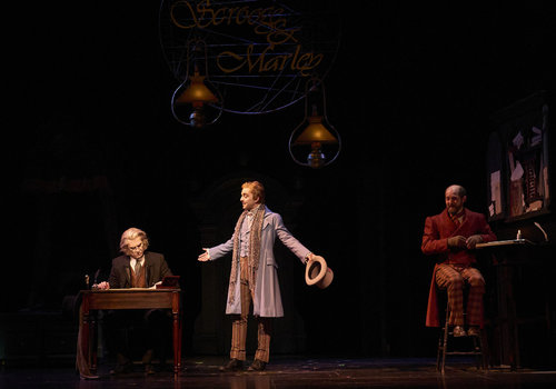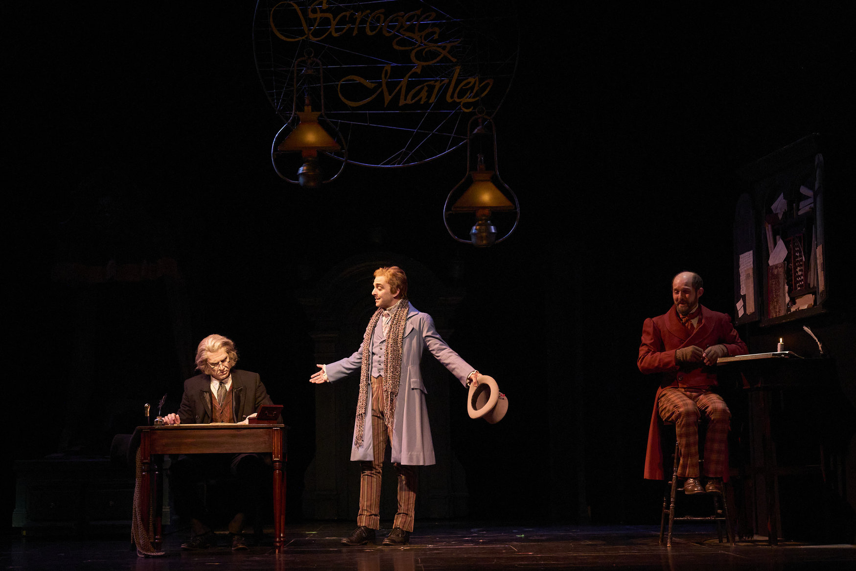 Ebenezer Scrooge (actor, Nick Steen*) turns away two charity workers (actors from L to R, M.A. Taylor* and Kyle Arzaga) as his clerk, Bob Cratchit (actor, James Alexander Rankin*), works in Great Lakes Theater’s production of Charles Dickens’ holiday classic A CHRISTMAS CAROL onstage at the Mimi Ohio Theatre, Playhouse Square through December 22. (Photography by Roger Mastroianni)