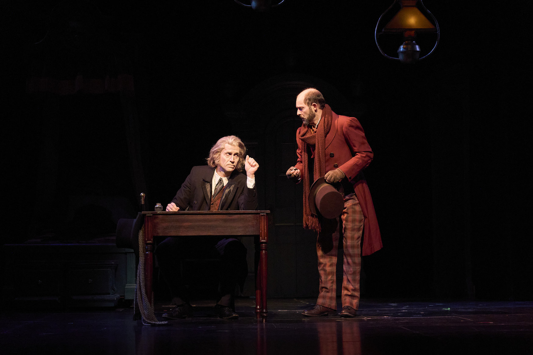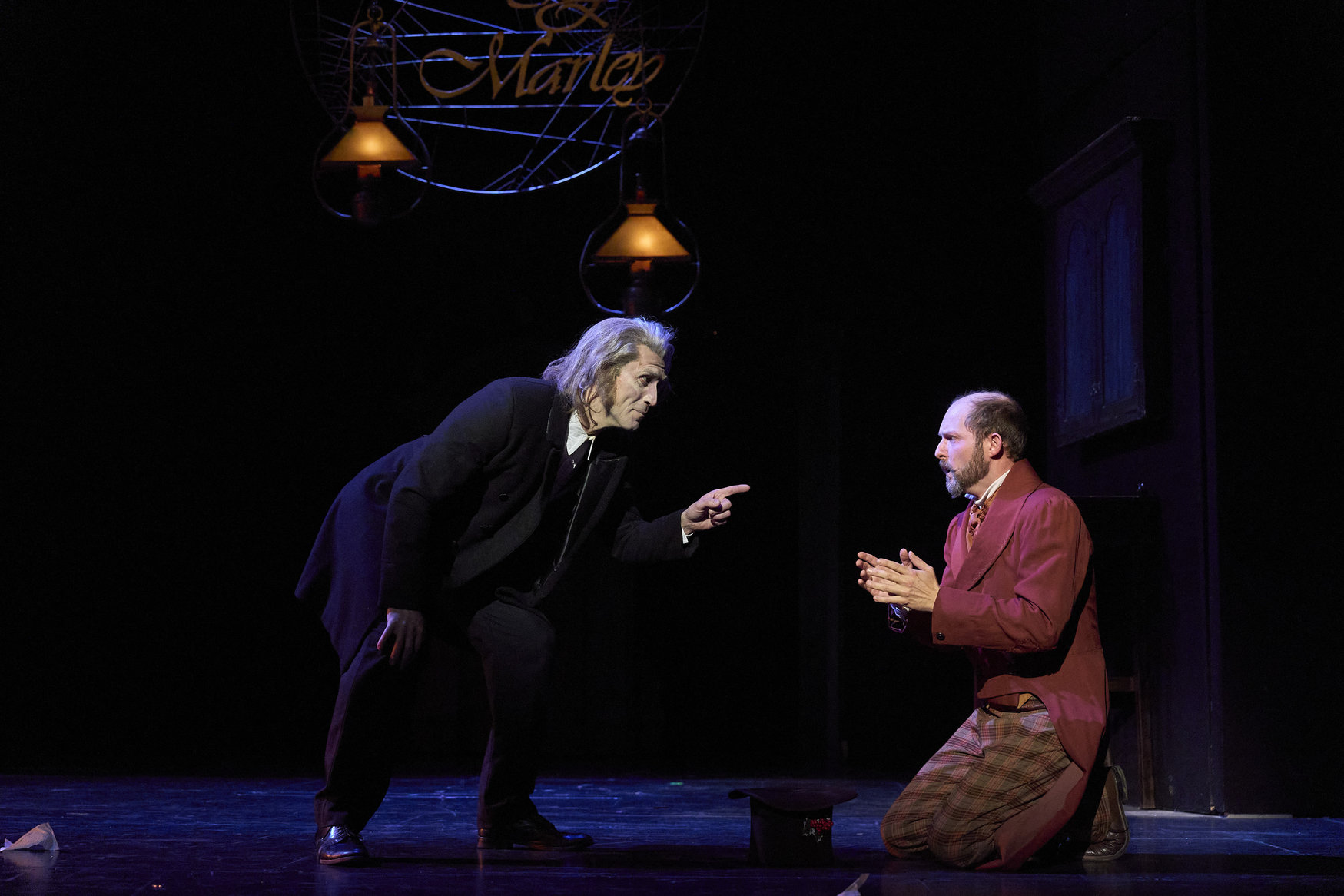 Scrooge (actor, Nick Steen*) gives stern warning to Bob Cratchit (actor, James Alexander Rankin*) in Great Lakes Theater’s production of Charles Dickens’ holiday classic A CHRISTMAS CAROL onstage at the Mimi Ohio Theatre, Playhouse Square through December 22. (Photography by Roger Mastroianni)
