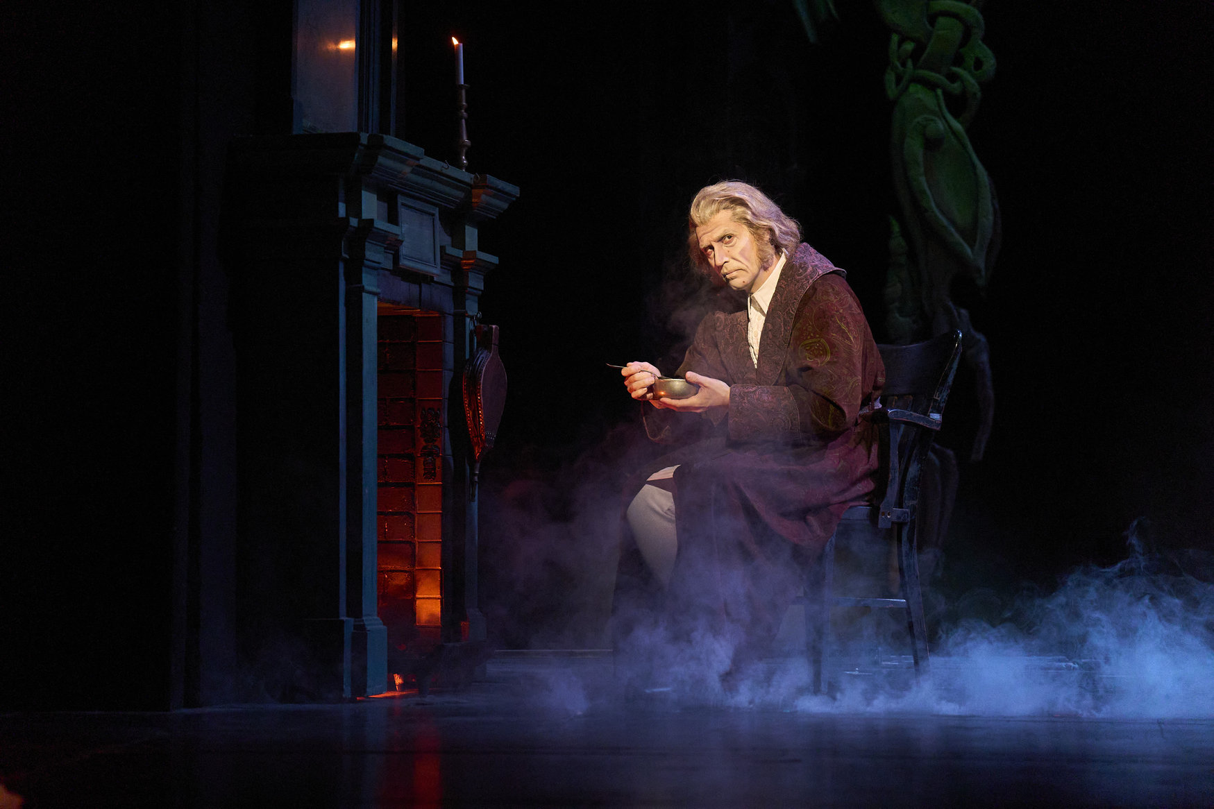 Scrooge (actor, Nick Steen*) is wary as he sits for dinner in Great Lakes Theater’s production of Charles Dickens’ holiday classic A CHRISTMAS CAROL onstage at the Mimi Ohio Theatre, Playhouse Square through December 22. (Photography by Roger Mastroianni)