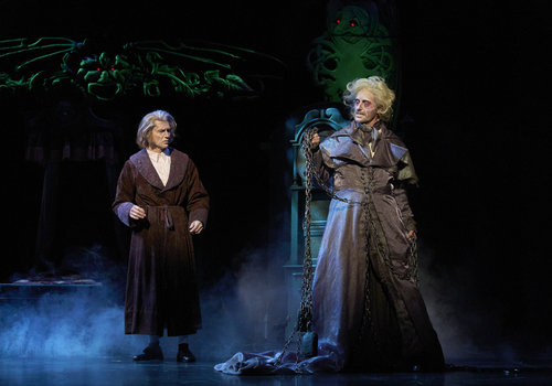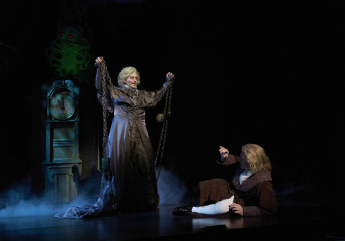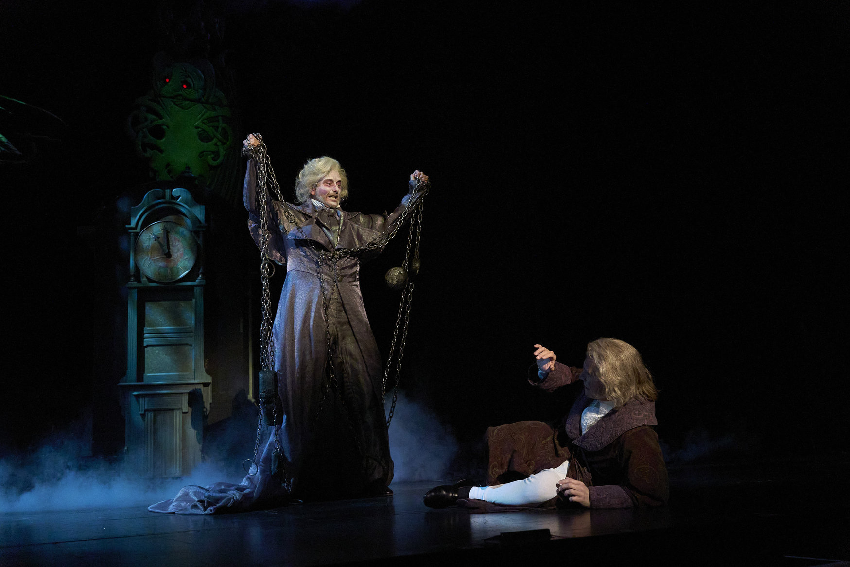 The Ghost of Jacob Marley (actor, Jeffrey C. Hawkins*) tells Ebenezer Scrooge (actor, Nick Steen*) the story of his chains in Great Lakes Theater’s production of Charles Dickens’ holiday classic A CHRISTMAS CAROL onstage at the Mimi Ohio Theatre, Playhouse Square through December 22. (Photography by Roger Mastroianni)