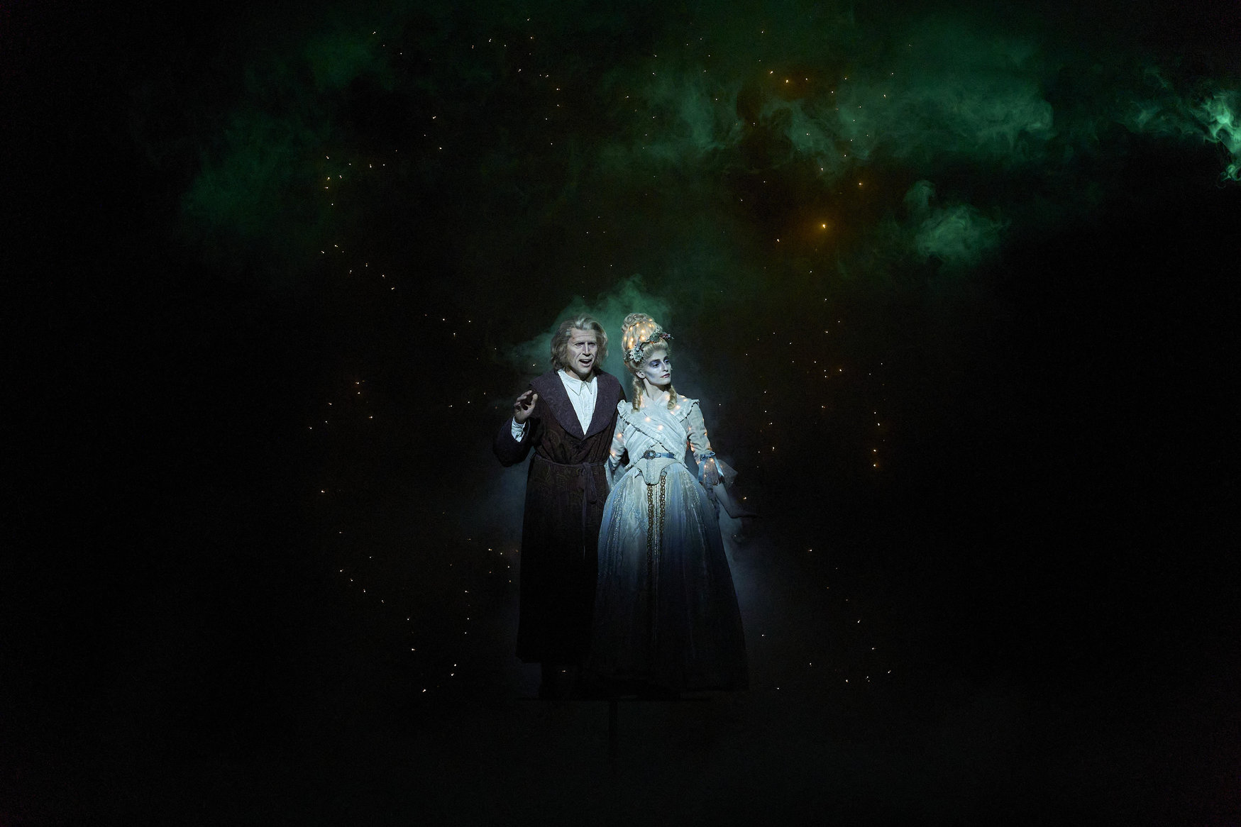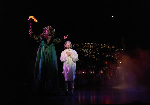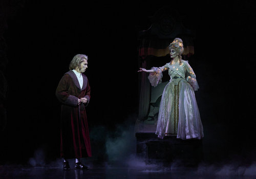 The Ghost of Christmas Past (actor, Ángela Utrera*) summons Ebenezer Scrooge (actor Nick Steen*) for a journey to his past in Great Lakes Theater’s production of Charles Dickens’ holiday classic A CHRISTMAS CAROL onstage at the Mimi Ohio Theatre, Playhouse Square through December 22. (Photography by Roger Mastroianni)
