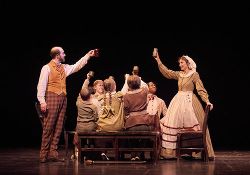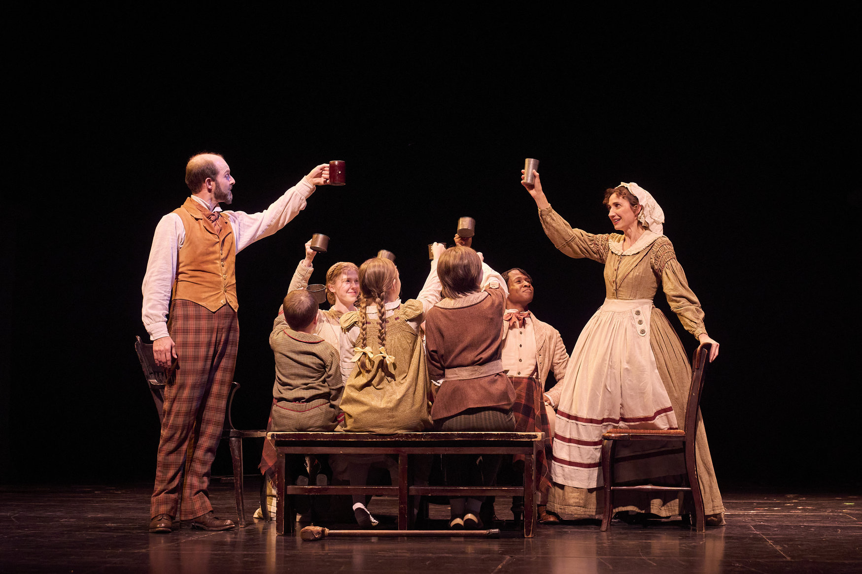 The Cleaveland family (actors from L to R: Aamar-Malik Culbreth, Morgan Lehman, Marlowe Miller, Laura Welsh*, Paige Lewis, Anthony Patrick Kenney, Eileen Brady and James Alexander Rankin*) finish the annual retelling of Charles Dickens classic A CHRISTMAS CAROL in Great Lakes Theater’s production of Charles Dickens’ holiday classic A CHRISTMAS CAROL onstage at the Mimi Ohio Theatre, Playhouse Square through December 22. (Photography by Roger Mastroianni)