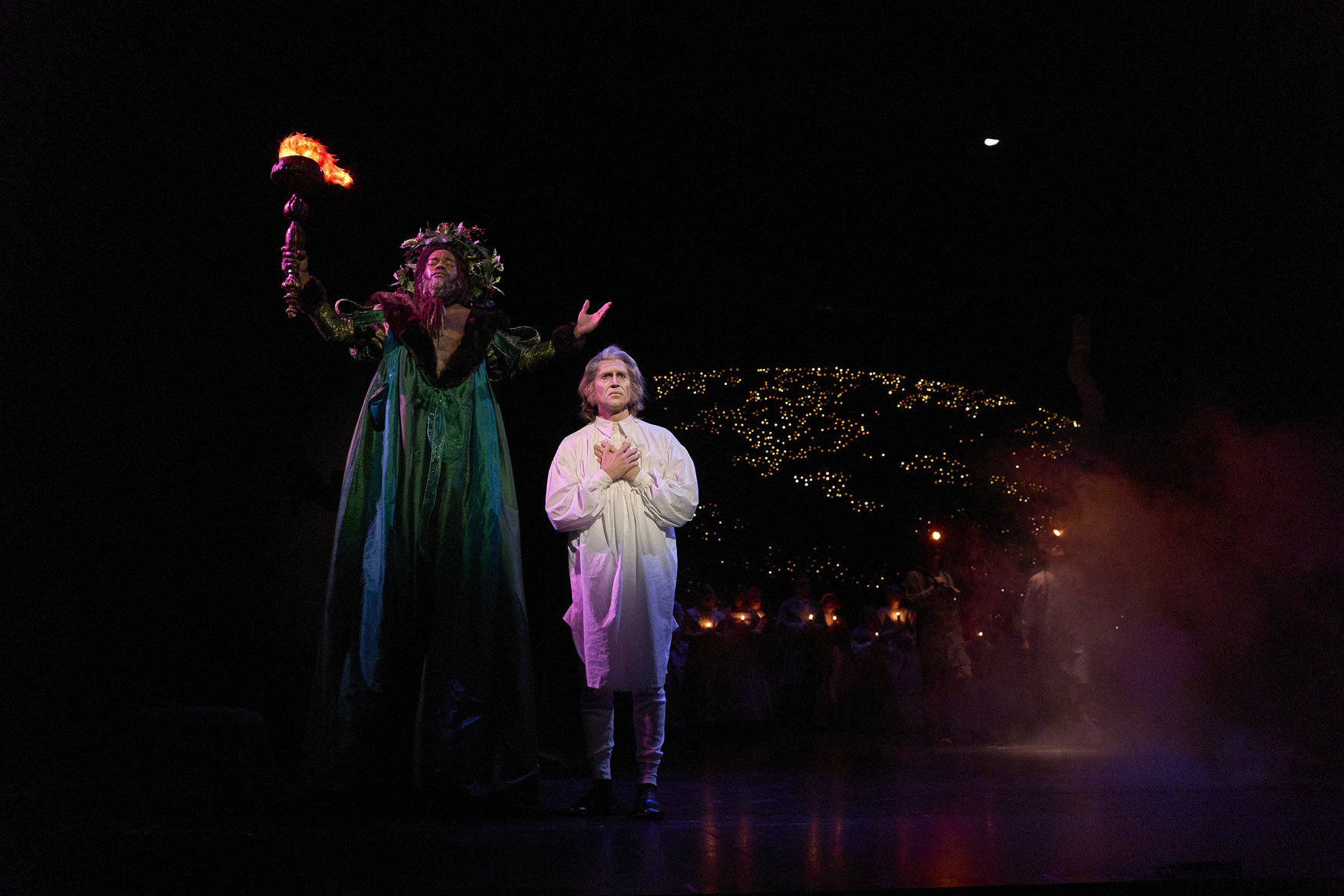 Scrooge (actor, Nick Steen*) is affected by the various scenes of Christmas across the world that The Ghost of Christmas Present (actor, Dominique Champion*) shares during their journey in Great Lakes Theater’s production of Charles Dickens’ holiday classic A CHRISTMAS CAROL onstage at the Mimi Ohio Theatre, Playhouse Square through December 22. (Photography by Roger Mastroianni)