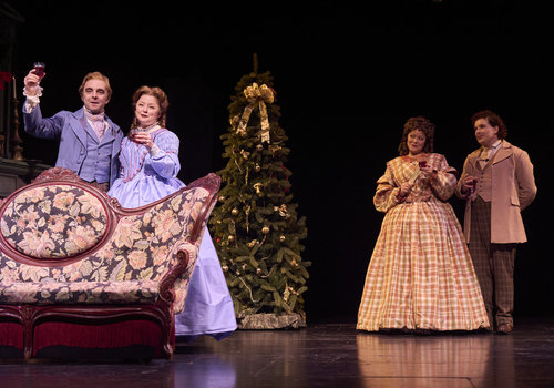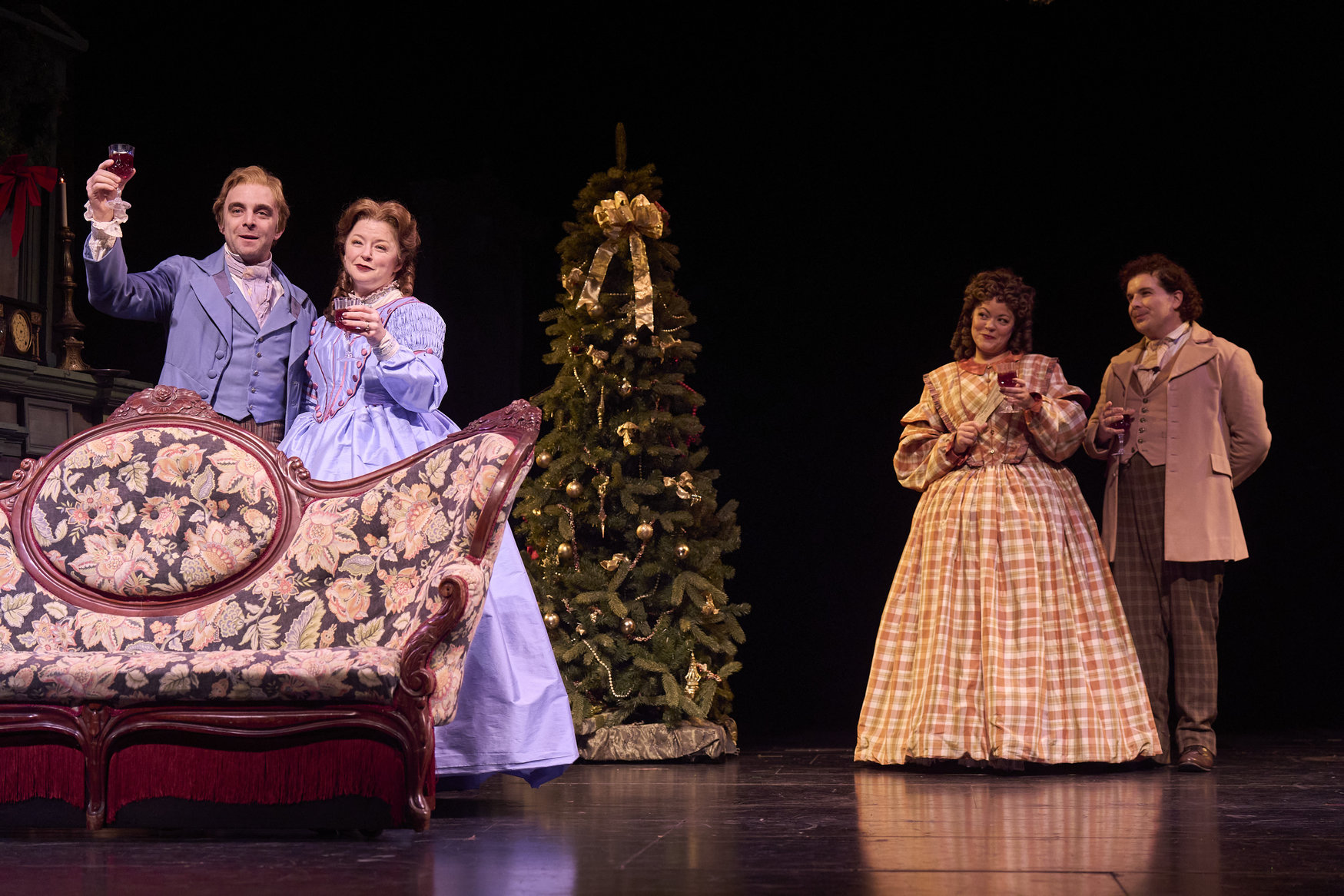 Nephew Fred (actor, Joe Wegner*), Fred's Wife (actor, Laura Welsh*), Cynthia (actor, Jessie Cope Miller*) and Topper (actor, Boe Wank*) share a reluctant toast to Scrooge during their Christmas festivities in Great Lakes Theater’s production of Charles Dickens’ holiday classic A CHRISTMAS CAROL onstage at the Mimi Ohio Theatre, Playhouse Square through December 22. (Photography by Roger Mastroianni)