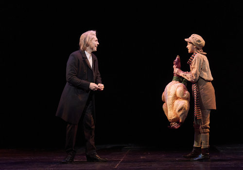 Scrooge (actor, Nick Steen*) pays a delivery boy (actor, Ada Shapiro) to surprise the Cratchits with a prize turkey in Great Lakes Theater’s production of Charles Dickens’ holiday classic A CHRISTMAS CAROL onstage at the Mimi Ohio Theatre, Playhouse Square through December 22. (Photography by Roger Mastroianni)