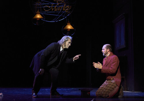 Scrooge (actor, Nick Steen*) surprises Bob Cratchit (actor, James Alexander Rankin*) with his change after Christmas in Charles Dickens' holiday classic A CHRISTMAS CAROL onstage at the Mimi Ohio Theatre, Playhouse Square, which runs through December 22. (Photography by Roger Mastroianni)