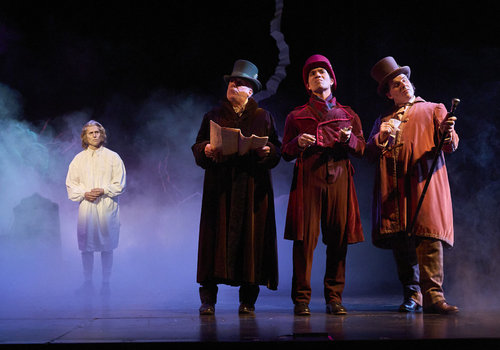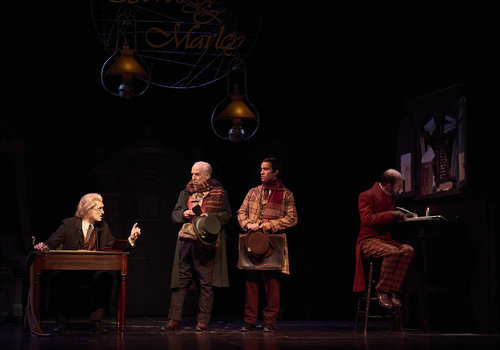 Scrooge (actor, Nick Steen*) observes as some wealthy men (actors from L to R: M.A. Taylor*, Kyle Arzaga and Boe Wank*) discuss a miserly individual's passing in Great Lakes Theater’s production of Charles Dickens’ holiday classic A CHRISTMAS CAROL onstage at the Mimi Ohio Theatre, Playhouse Square through December 22. (Photography by Roger Mastroianni)