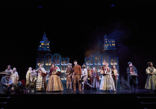 The London streets are full of holiday merriment in Great Lakes Theater’s production of Charles Dickens’ holiday classic A CHRISTMAS CAROL onstage at the Mimi Ohio Theatre, Playhouse Square through December 22. Actors featured from L to R: Amber Hurst Martin*, Joe Wegner*, Sutton Garver, Laci Grace Glasser, Morgan Lehman, Paige Lewis, Jodi Dominick*, Jessie Cope Miller*, Ada Shapiro, Kyle MacDonald, Aamar-Malik Culbreth, Fiona Thackaberry Stevens, Eileen Brady, Marlowe Miller, M.A. Taylor* and Madeline Curtis. (Photography by Roger Mastroianni)