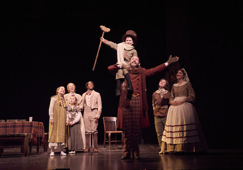 Bob Cratchit (actor, James Alexander Rankin*) lifts Tiny Tim (actor, Anthony Patrick Kenney) as the Cratchit family (actors from L to R: Morgan Lehman, Eileen Brady, Paige Lewis, Aamar-Malik Culbreth, Marlowe Miller and Jodi Dominick*) looks on in Great Lakes Theater’s production of Charles Dickens’ holiday classic A CHRISTMAS CAROL onstage at the Mimi Ohio Theatre, Playhouse Square through December 22. (Photography by Roger Mastroianni)