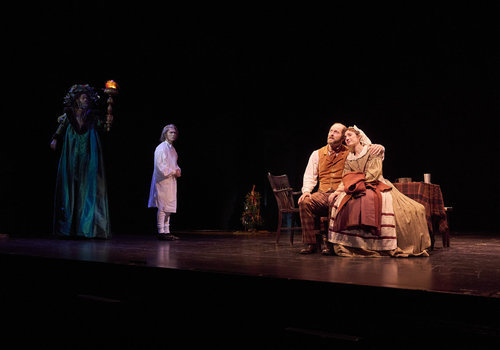 The Ghost of Christmas Present (actor, Dominique Champion*) shares a tender moment between Bob Cratchit (actor, James Alexander Rankin*) and his wife (actor, Jodi Dominick*) with Scrooge (actor, Nick Steen*) in Great Lakes Theater’s production of Charles Dickens’ holiday classic A CHRISTMAS CAROL onstage at the Mimi Ohio Theatre, Playhouse Square through December 22. (Photography by Roger Mastroianni)