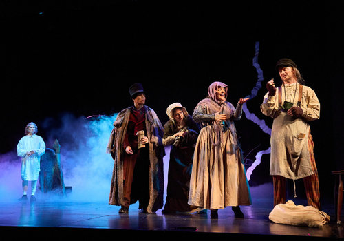 Scrooge (actor, Nick Steen*) watches as the Laundress (actor, Jessie Cope Miller*) trades with Joe the Keeper (actor, Jeffrey C. Hawkins*) as the Charwoman (actor, Jodi Dominick*) and Undertaker (actor, Kyle Arzaga) wait in Great Lakes Theater’s production of Charles Dickens’ holiday classic A CHRISTMAS CAROL onstage at the Mimi Ohio Theatre, Playhouse Square through December 22. (Photography by Roger Mastroianni)