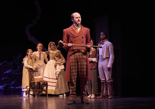 Bob Cratchit (actor, James Alexander Rankin*) mourns the loss of Tiny Tim as the Cratchit family (actors from L to R: Morgan Lehman, Eileen Brady, Jodi Dominick*, Paige Lewis, Marlow Miller and Aamar-Malik Culbreth) comfort one another in Great Lakes Theater’s production of Charles Dickens’ holiday classic A CHRISTMAS CAROL onstage at the Mimi Ohio Theatre, Playhouse Square through December 22. (Photography by Roger Mastroianni)