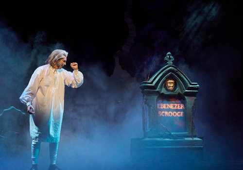 Scrooge (actor, Nick Steen*) reacts to seeing his potential future in Great Lakes Theater’s production of Charles Dickens’ holiday classic A CHRISTMAS CAROL onstage at the Mimi Ohio Theatre, Playhouse Square through December 22. (Photography by Roger Mastroianni)