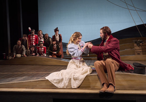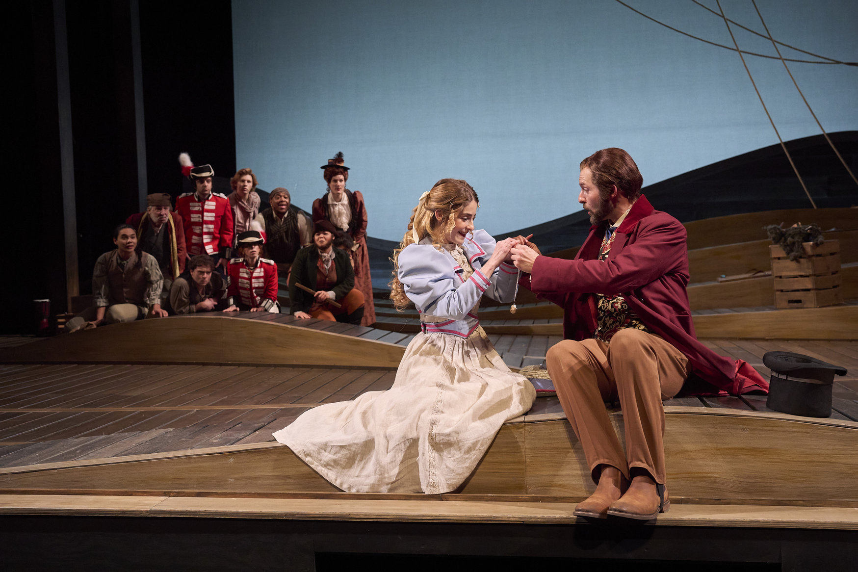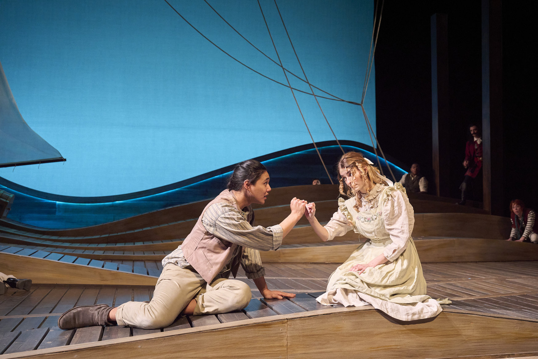 Lord Astor (actor, James Alexander Rankin*) gifts Molly (actor, Ángela Utrera*) a special amulet as the adventure begins in the Great Lakes Theater production of Peter and the Starcatcher at the Hanna Theatre, Playhouse Square, running through March 2. Also featured from left to right, Benjamin Michael Hall*, M.A. Taylor*, Joe Wegner*, Evan Stevens*, Nic Scott Hermick*, Theo Allyn*, Dar'Jon Marquise Bentley, Jessie Cope Miller* and Grayson Heyl*. (Photo by Roger Mastroianni) *Member Actors' Equity Association, the Union of Professional Actors and Stage Managers in the United States