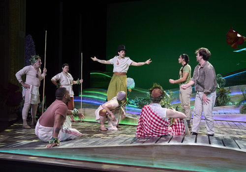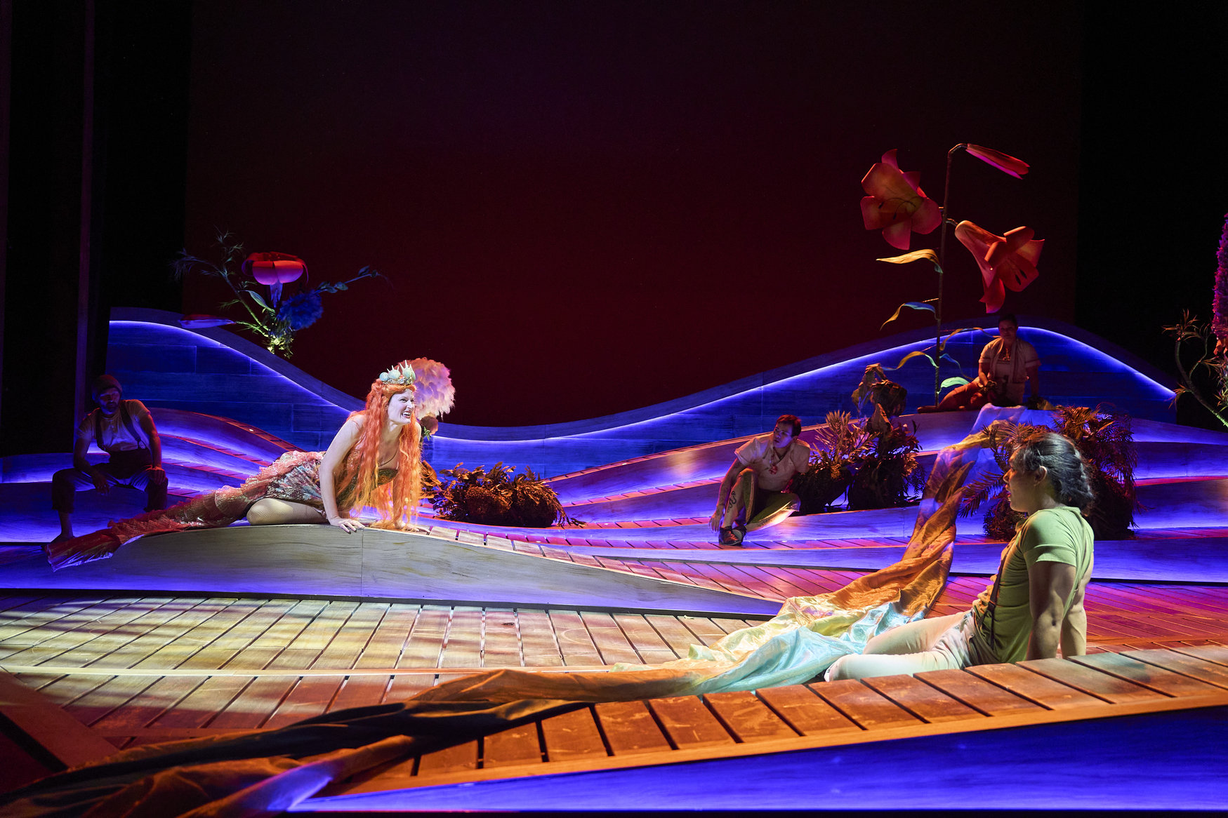 The mermaids (actors from left to right, Ángela Utrera*, Evan Stevens*, James Alexander Rankin*, Grayson Heyl*, Jeremy Gallardo*, Nic Scott Hermick*, Joe Wegner*, Dar’Jon Marquise Bentley, M.A. Taylor* and Jessie Cope Miller*) share their creation story in the Great Lakes Theater production of Peter and the Starcatcher at the Hanna Theatre, Playhouse Square, running through March 2. (Photo by Roger Mastroianni) *Member Actors' Equity Association, the Union of Professional Actors and Stage Managers in the United States