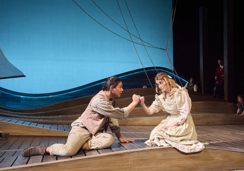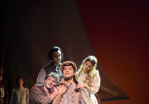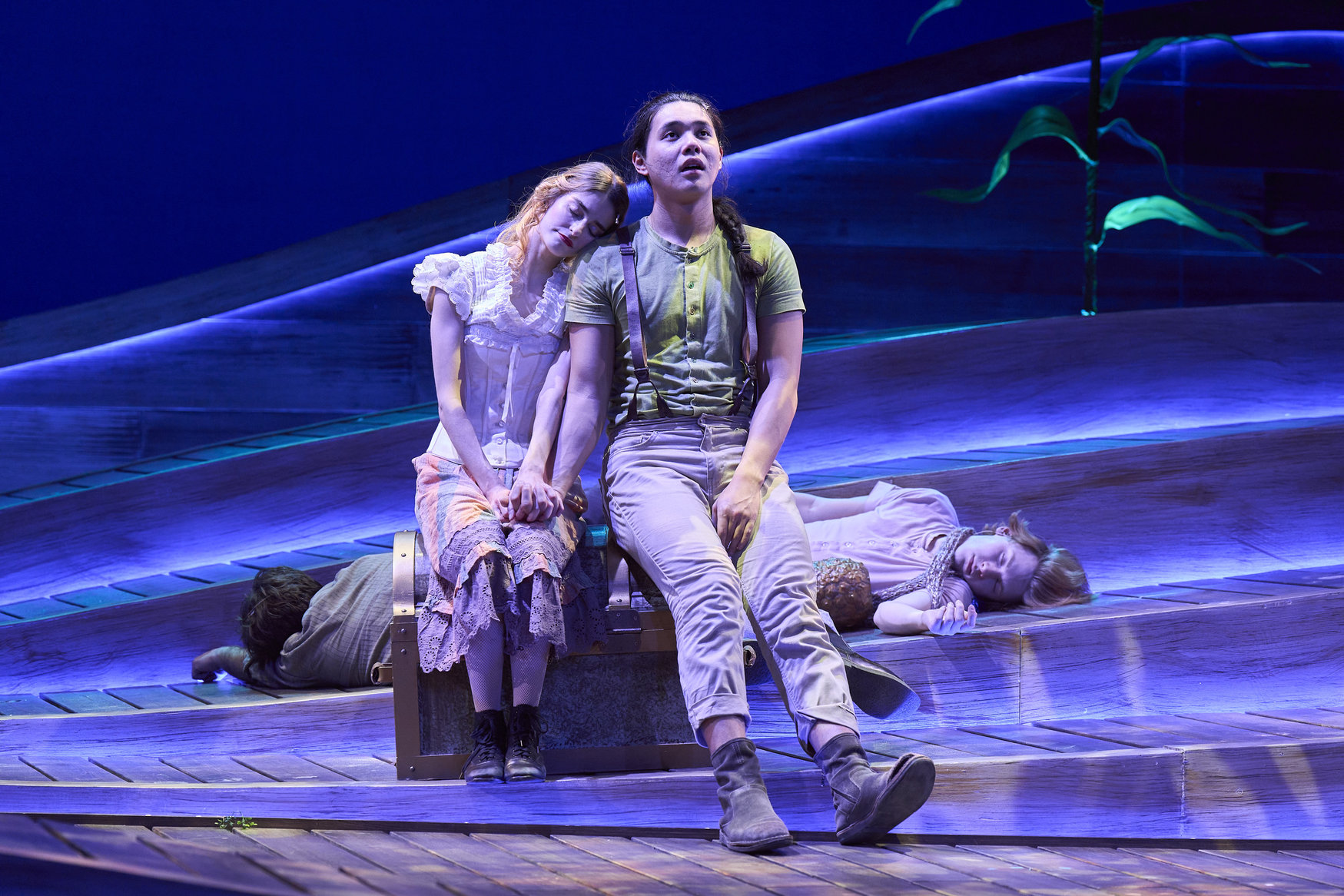 Molly (actor, Ángela Utrera*) and Boy (actor, Benjamin Michael Hall*) share a tender moment as Prentiss (actor, Evan Stevens*) and Prentiss (actor, Nic Scott Hermick*) sleep in the Great Lakes Theater production of Peter and the Starcatcher at the Hanna Theatre, Playhouse Square, running through March 2. (Photo by Roger Mastroianni) *Member Actors' Equity Association, the Union of Professional Actors and Stage Managers in the United States