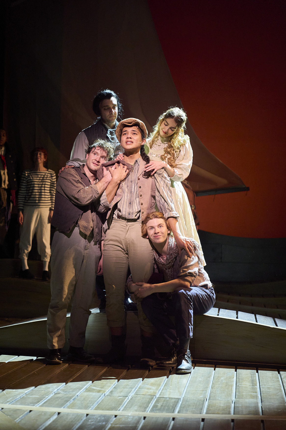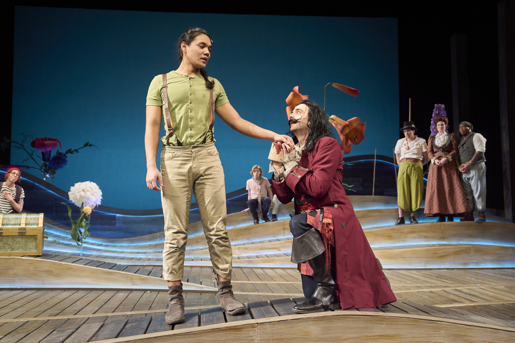Black Stache (actor, Joe Wegner*) has a proposal for Boy (actor, Benjamin Michael Hall*) in the Great Lakes Theater production of Peter and the Starcatcher at the Hanna Theatre, Playhouse Square, running through March 2. Also featured from left to right, Theo Allyn*, Nic Scott Hermick*, Jeremy Gallardo*, Grayson Heyl* and Dar’Jon Marquise Bentley. (Photo by Roger Mastroianni) *Member Actors' Equity Association, the Union of Professional Actors and Stage Managers in the United States