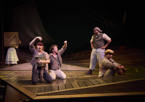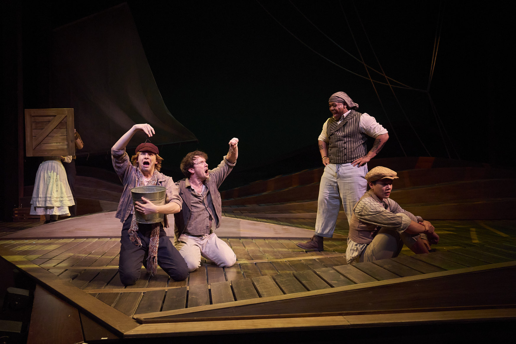 Prentiss (actor, Evan Stevens*), Molly (actor, Ángela Utrera*), Ted (actor, Nic Scott Hermick*) and Boy (actor, Benjamin Michael Hall*) await Mr. Grin in the Great Lakes Theater production of Peter and the Starcatcher at the Hanna Theatre, Playhouse Square, running through March 2. (Photo by Roger Mastroianni) *Member Actors' Equity Association, the Union of Professional Actors and Stage Managers in the United States