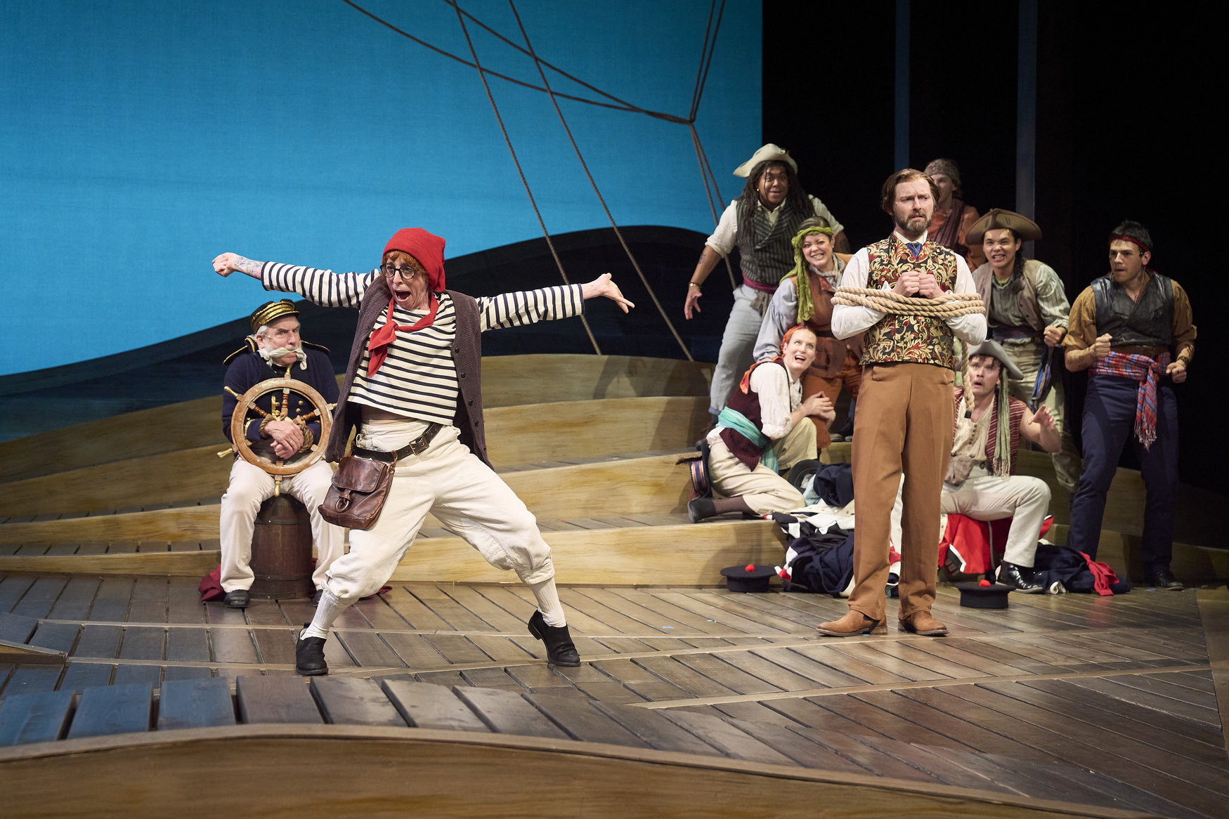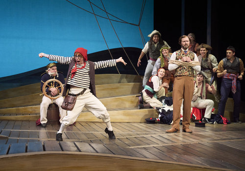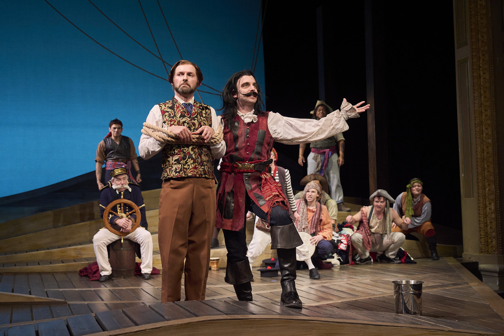 Smee (actor, Theo Allyn*) shares the current predicament to Lord Astor (actor, James Alexander Rankin*) as his fellow pirates (actors from left to right Dar'Jon Marquise Bentley, Jessie Cope Miller*, Grayson Heyl*, Evan Stevens*, Nic Scott Hermick*, Benjamin Michael Hall* and Jeremy Gallardo*) and Captain Scott (actor, M.A.Taylor*) look on in the Great Lakes Theater production of Peter and the Starcatcher at the Hanna Theatre, Playhouse Square, running through March 2. (Photo by Roger Mastroianni) *Member Actors' Equity Association, the Union of Professional Actors and Stage Managers in the United States