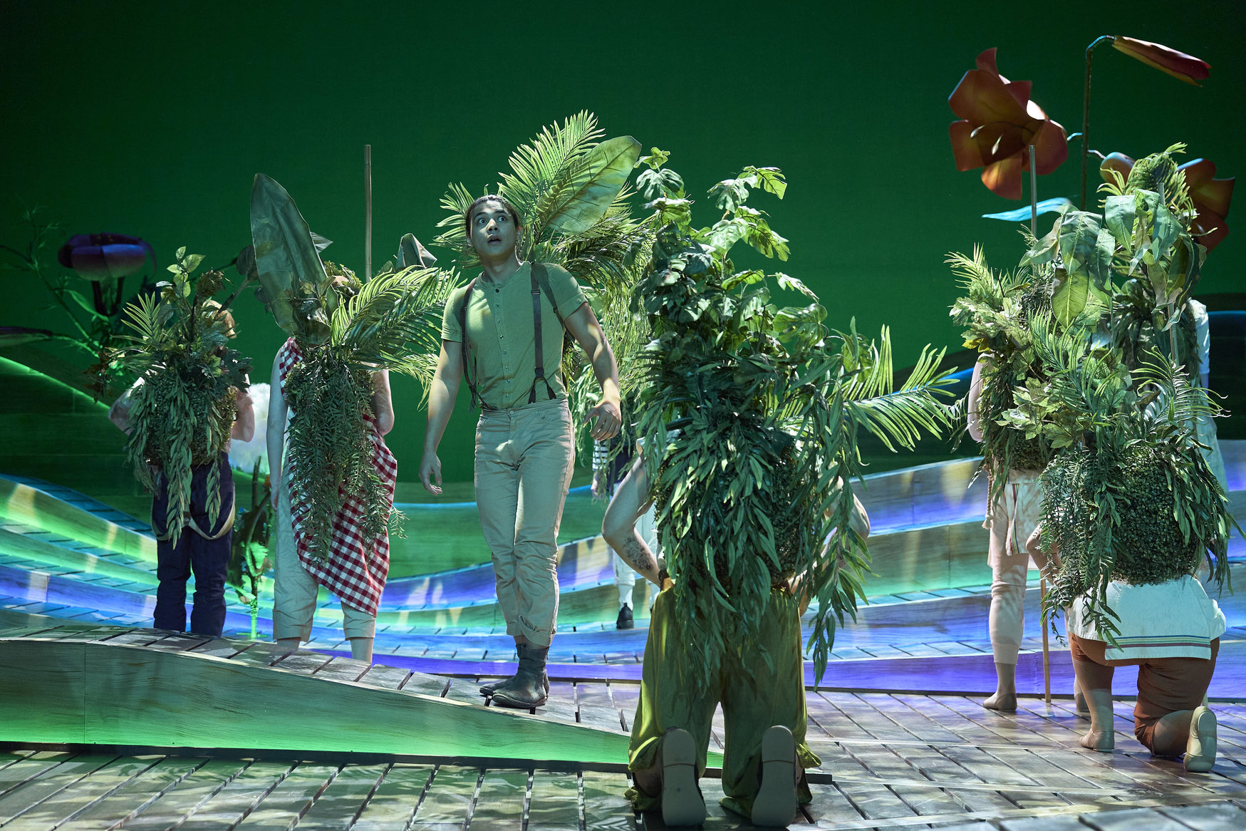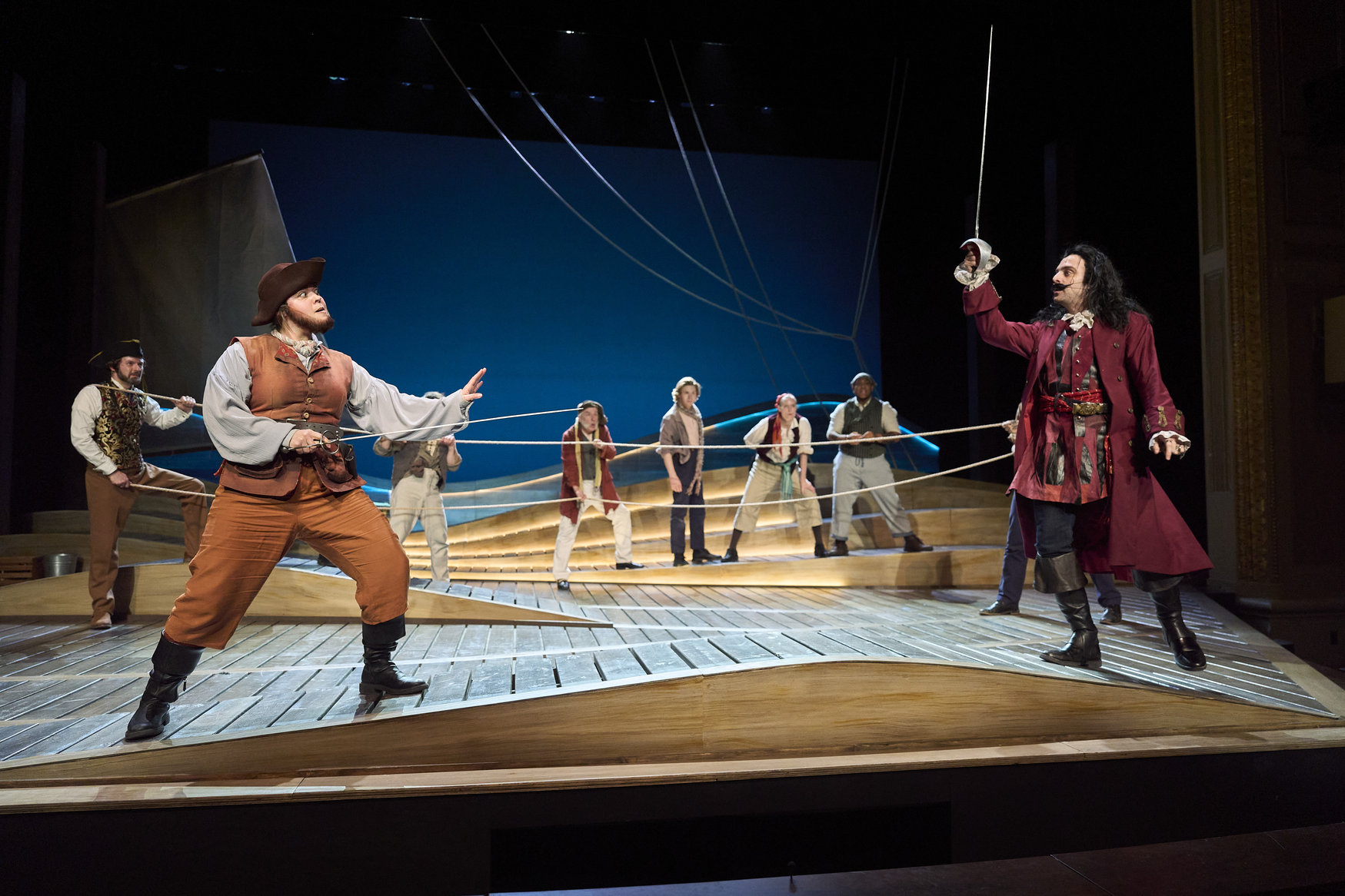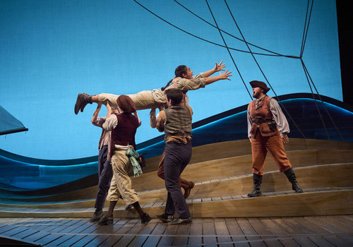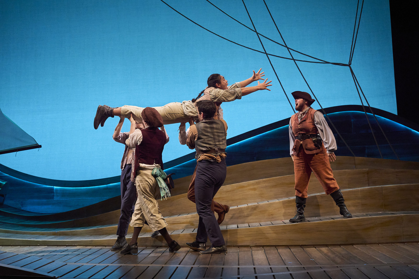 Peter (actor, Benjamin Michael Hall*) takes flight in the Great Lakes Theater production of Peter and the Starcatcher at the Hanna Theatre, Playhouse Square, running through March 2. Also featured from left to right, Grayson Heyl*, M.A. Taylor*, Dar’Jon Marquise Bentley, Evan Stevens*, Jeremy Gallardo*, James Alexander Rankin*, Nic Scott Hermick*, Theo Allyn* and Jessie Cope Miller*) (Photo by Roger Mastroianni) *Member Actors' Equity Association, the Union of Professional Actors and Stage Managers in the United States