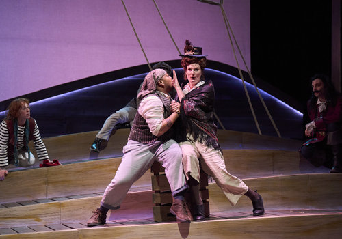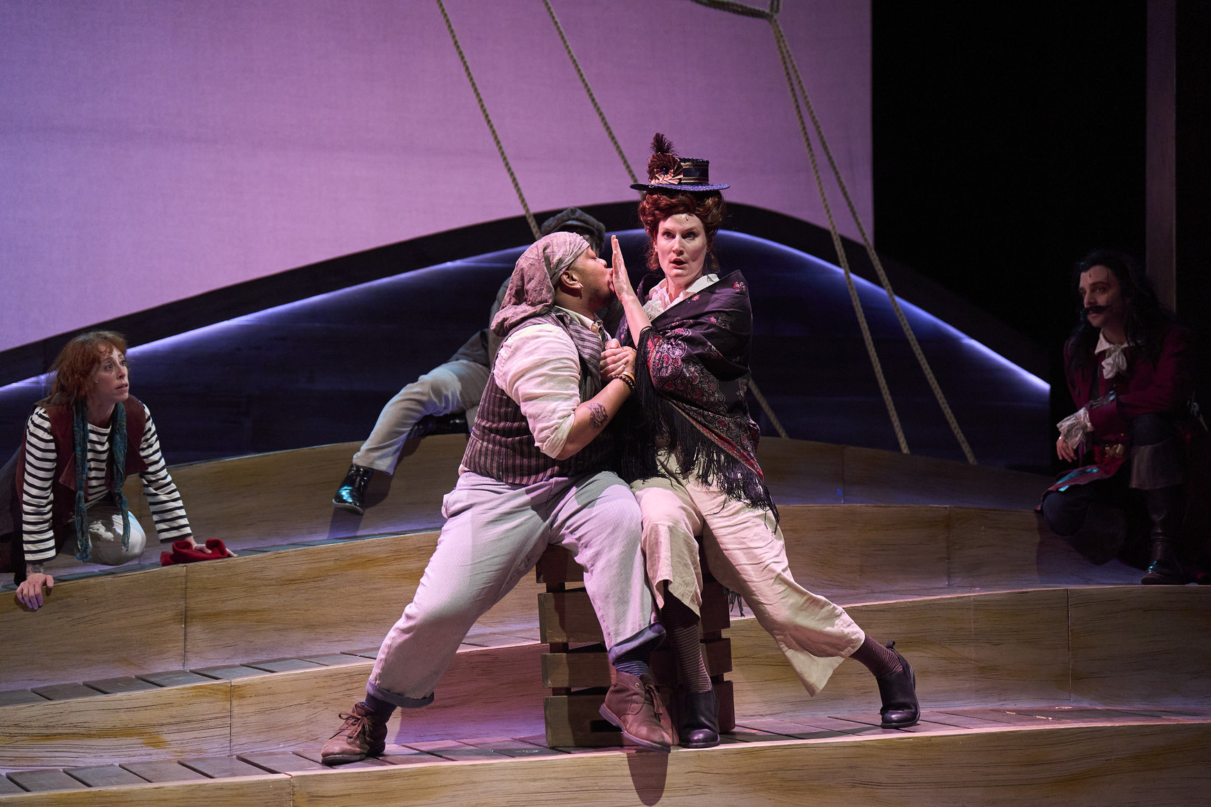 Mrs. Bumbrake (actor, Grayson Heyl*) stops a romantic moment with Alf (actor, Dar’Jon Marquise Bentley) in the Great Lakes Theater production of Peter and the Starcatcher at the Hanna Theatre, Playhouse Square, running through March 2. Also featured from left to right, Theo Allyn* and Joe Wegner*. (Photo by Roger Mastroianni) *Member Actors' Equity Association, the Union of Professional Actors and Stage Managers in the United States