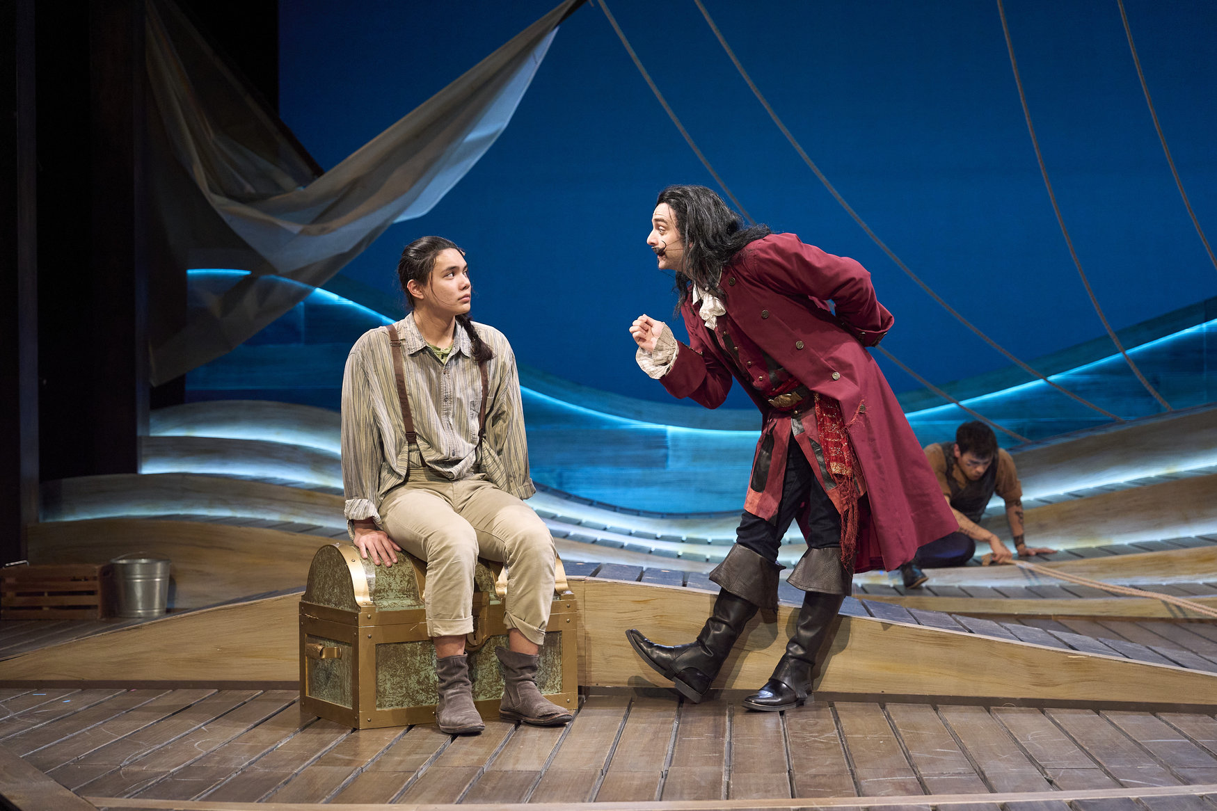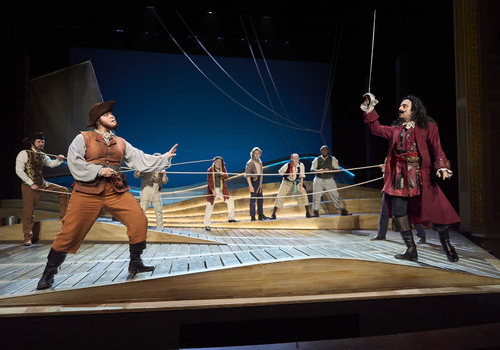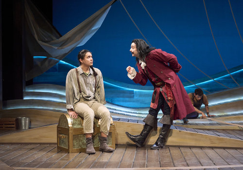 Black Stache (actor, Joe Wegner*) confronts Boy (actor, Benjamin Michael Hall*) in the Great Lakes Theater production of Peter and the Starcatcher at the Hanna Theatre, Playhouse Square, running through March 2. Also featured, Jeremy Gallardo*. (Photo by Roger Mastroianni) *Member Actors' Equity Association, the Union of Professional Actors and Stage Managers in the United States