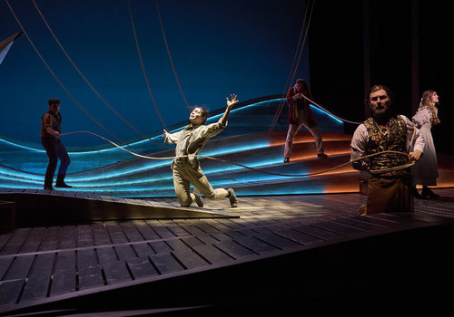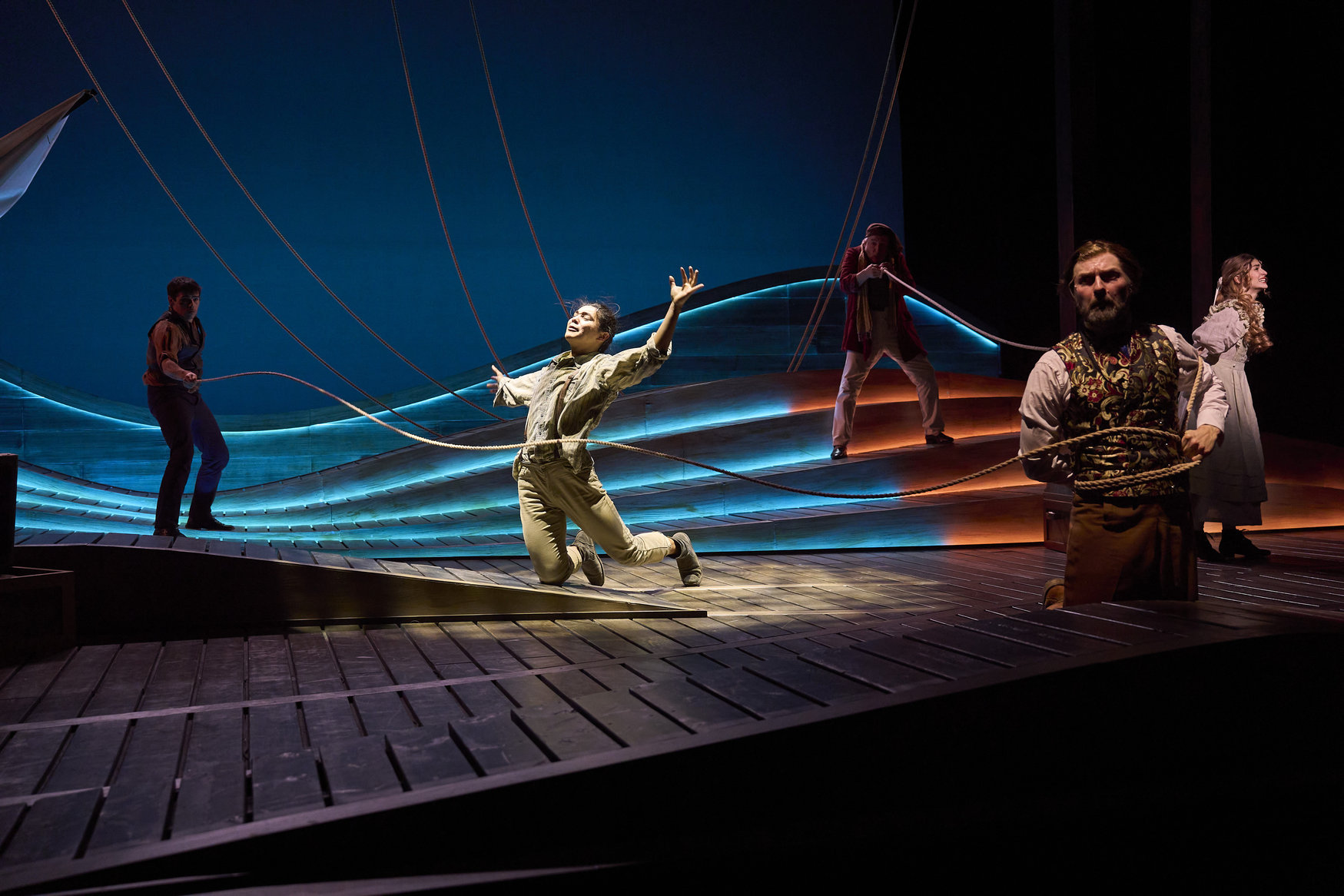 Boy (actor, Benjamin Michael Hall*) finds himself overboard once again as Molly (actor, Ángela Utrera*) calls for him in the Great Lakes Theater production of Peter and the Starcatcher at the Hanna Theatre, Playhouse Square, running through March 2. Also featured from left to right, Jeremy Gallardo*, M.A. Taylor* and James Alexander Rankin*. (Photo by Roger Mastroianni) *Member Actors' Equity Association, the Union of Professional Actors and Stage Managers in the United States