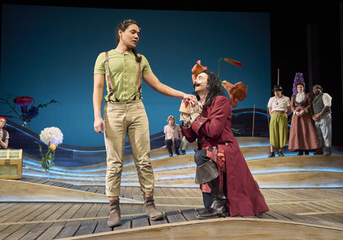 Teacher (actor, Grayson Heyl*) shares some magic with Boy (actor, Benjamin Michael Hall*) in the Great Lakes Theater production of Peter and the Starcatcher at the Hanna Theatre, Playhouse Square, running through March 2. Also featured, Jeremy Gallardo*. (Photo by Roger Mastroianni) *Member Actors' Equity Association, the Union of Professional Actors and Stage Managers in the United States