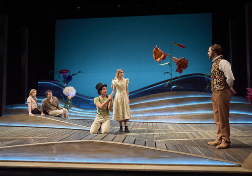 Boy (actor, Benjamin Michael Hall*) has fallen into the mermaid’s grotto where Teacher (actor, Grayson Heyl*) welcomes him in the Great Lakes Theater production of Peter and the Starcatcher at the Hanna Theatre, Playhouse Square, running through March 2. Also featured from left to right, James Alexander Rankin*, Jeremy Gallardo* and Jessie Cope Miller*. (Photo by Roger Mastroianni) *Member Actors' Equity Association, the Union of Professional Actors and Stage Managers in the United States
