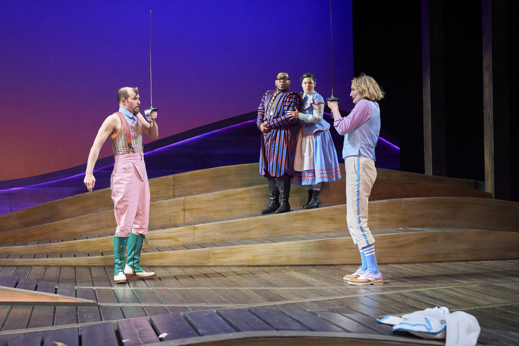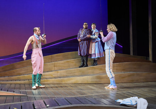Sir Andrew Aguecheek (actor, James Alexander Rankin*) confronts Cesario (actor, Grayson Heyl*) as Sir Toby Belch (actor, Dar’Jon Marquise Bentley) and Maria (actor, Jessie Cope Miller*) look on in the Great Lakes Theater production of Twelfth Night at the Hanna Theatre, Playhouse Square, running through April 6. (Photo by Roger Mastroianni) *Member Actors' Equity Association, the Union of Professional Actors and Stage Managers in the United States