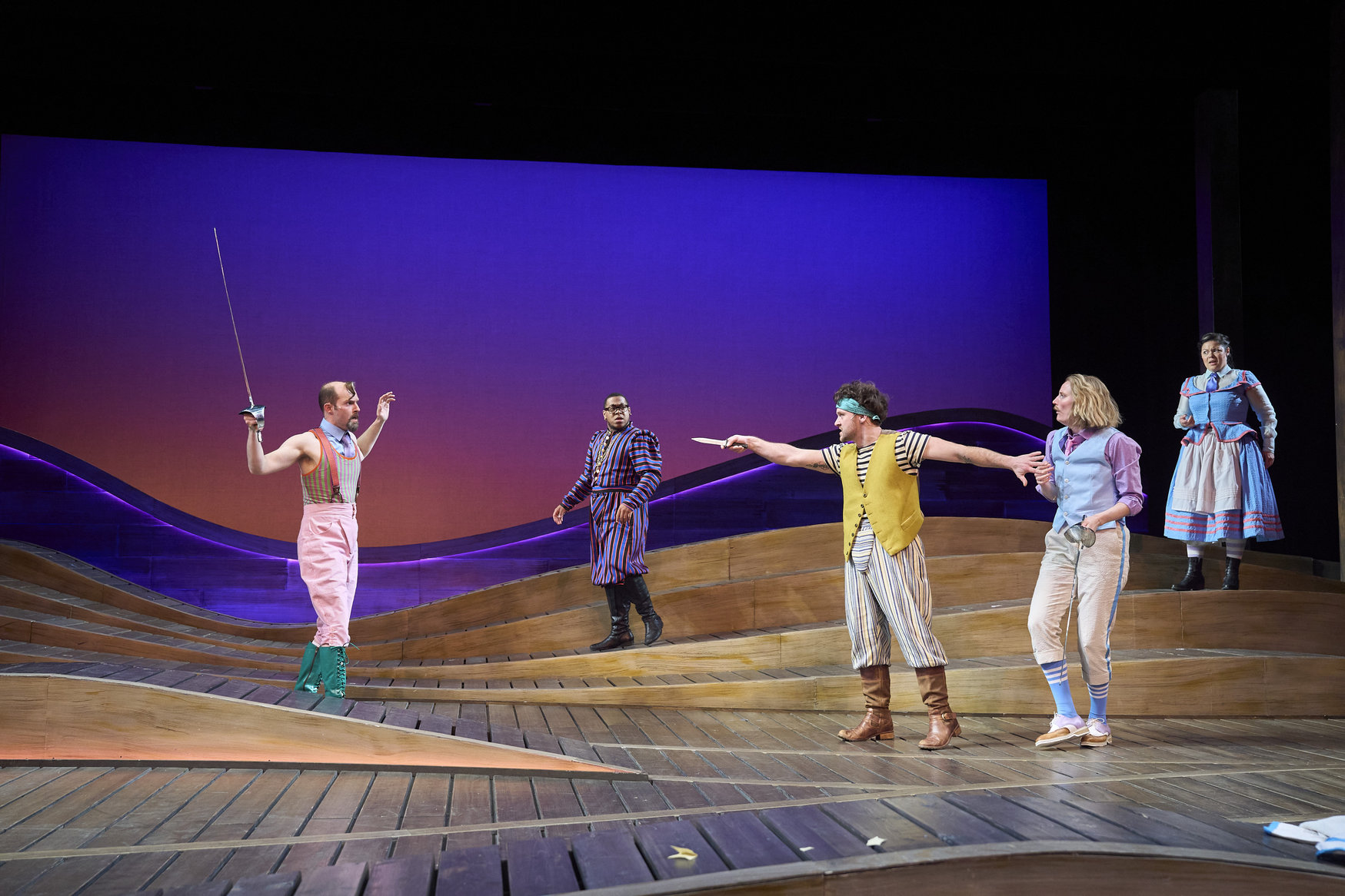 As mistaken identity continues to confound all involved, Antonio (actor, Evan Stevens*) looks to defend Cesario (actor, Grayson Heyl*) whom he believes is Sebastian as Sir Toby Belch (actor, Dar’Jon Marquise Bentley) and Maria (actor, Jessie Cope Miller*) stare in shock in the Great Lakes Theater production of Twelfth Night at the Hanna Theatre, Playhouse Square, running through April 6. (Photo by Roger Mastroianni) *Member Actors' Equity Association, the Union of Professional Actors and Stage Managers in the United States