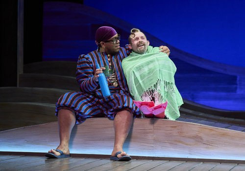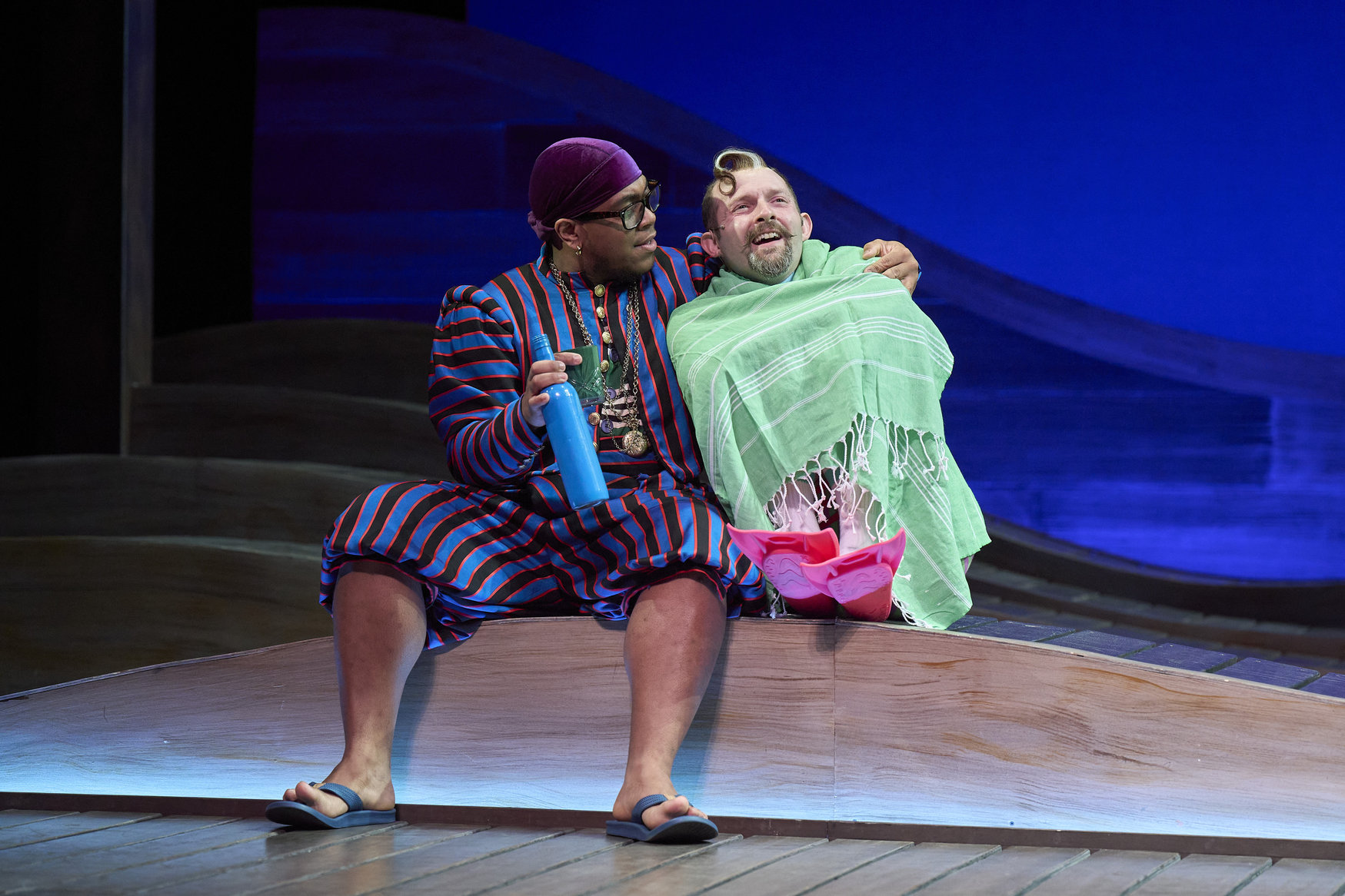 Sir Toby Belch (actor, Dar'Jon Marquise Bentley) consoles Sir Andrew Aguecheek (actor, James Alexander Rankin*) in the Great Lakes Theater production of Twelfth Night at the Hanna Theatre, Playhouse Square, running through April 6. (Photo by Roger Mastroianni) *Member Actors' Equity Association, the Union of Professional Actors and Stage Managers in the United States