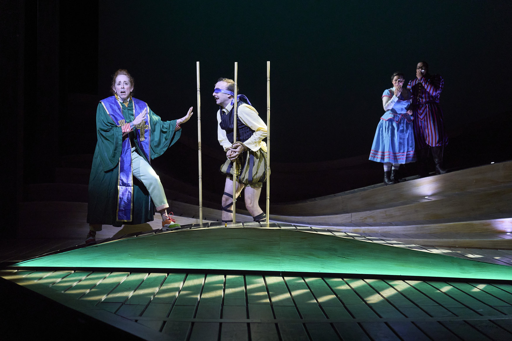 Maria (actor, Jessie Cope Miller*) chastises Feste (actor, Theo Allyn*) as Olivia (actor, Ángela Utrera*) mourns with Malvolio (actor, Joe Wegner*) in the Great Lakes Theater production of Twelfth Night at the Hanna Theatre, Playhouse Square, running through April 6. (Photo by Roger Mastroianni) *Member Actors' Equity Association, the Union of Professional Actors and Stage Managers in the United States